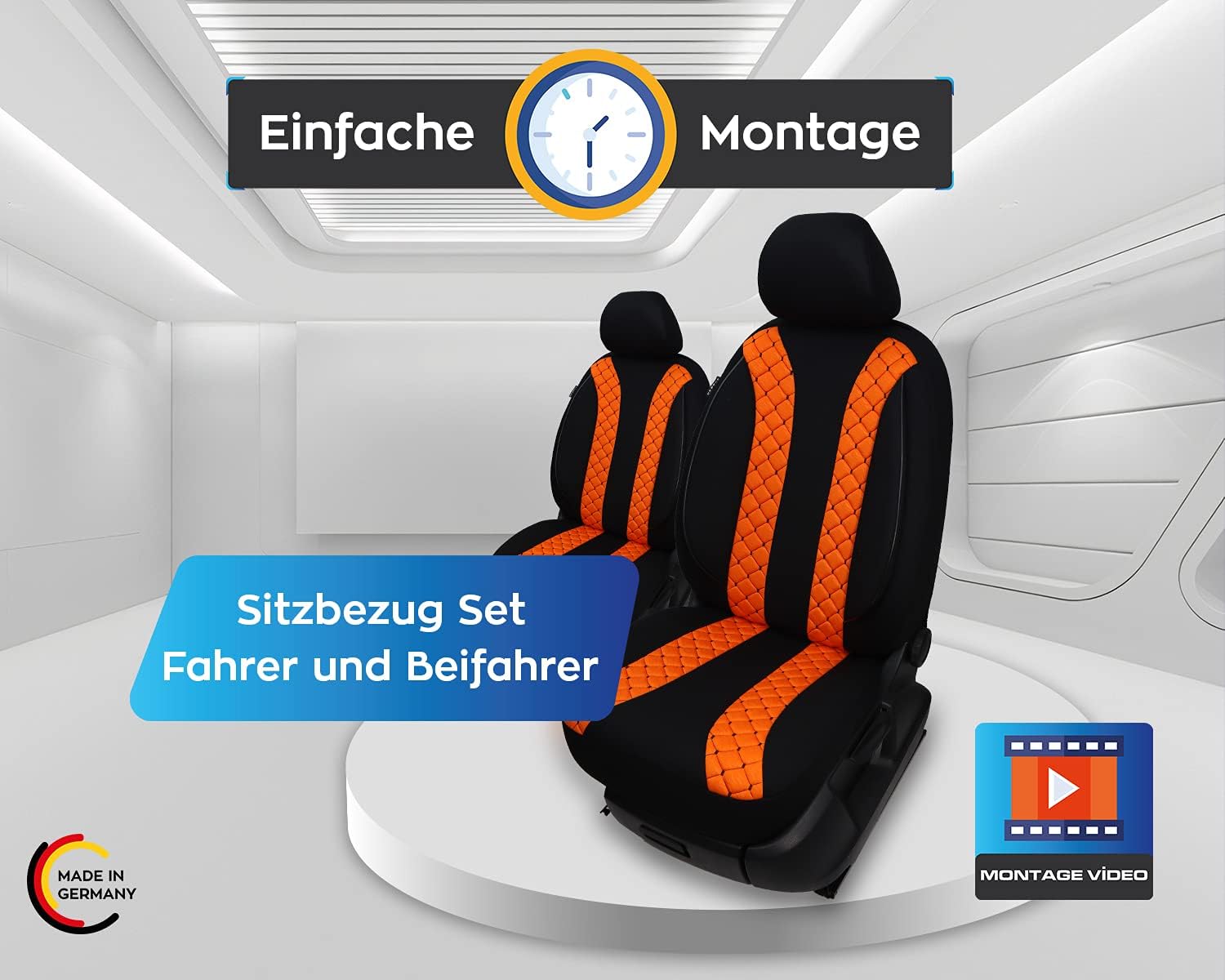 - Lieferumfang - 2x Sitzfläche, 1x Rückenlehne für Fahrer, 1x Rückenlehne für Beifahrer, 2x Kopfstützenbezüge, Klammer/Haken, Montageanleitung