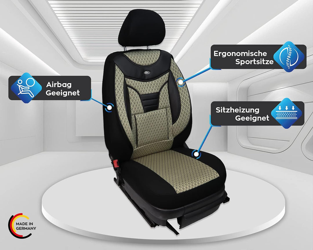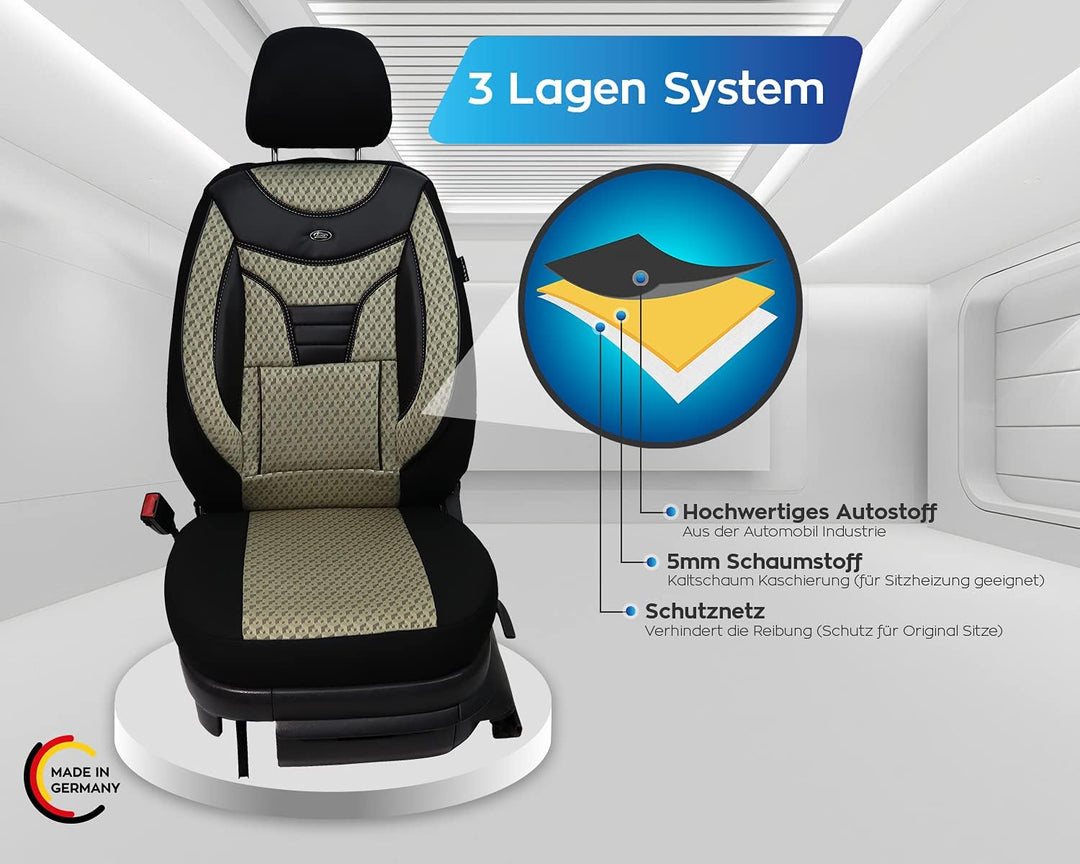 - Extras - 3 Lagen System, Sitzbezüge für Airbag und Sitzheizung geeignet, Rückenseite der Vordersitze mit grosszügigen Taschen ausgestattet, komfortables & sportliches Sitzgefühl