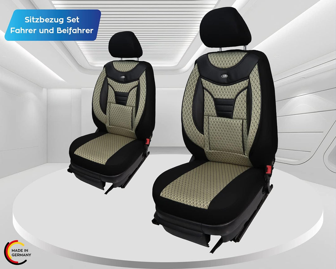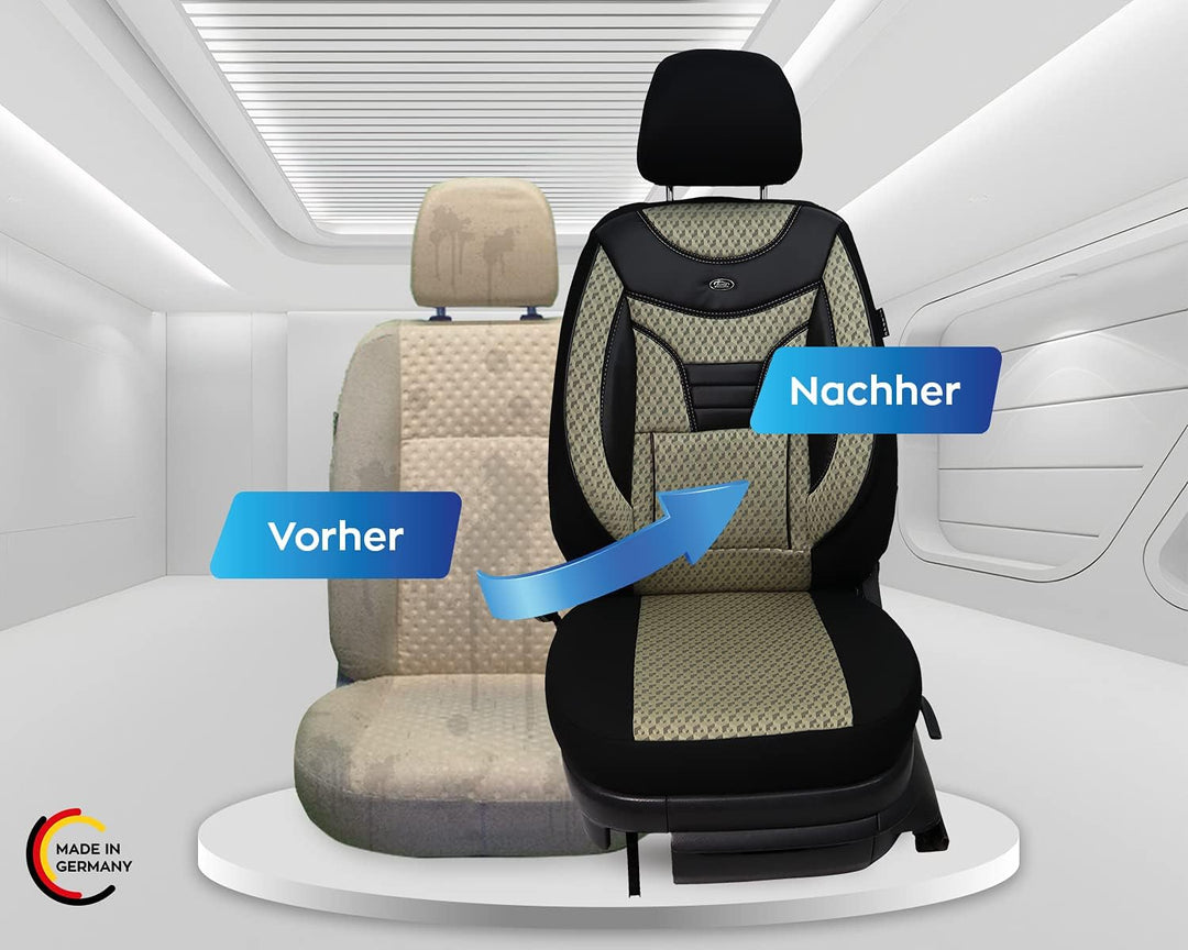 - Lieferumfang - 2x Sitzfläche, 1x Rückenlehne für Fahrer, 1x Rückenlehne für Beifahrer, 2x Kopfstützenbezüge, Klammer/Haken, Montageanleitung