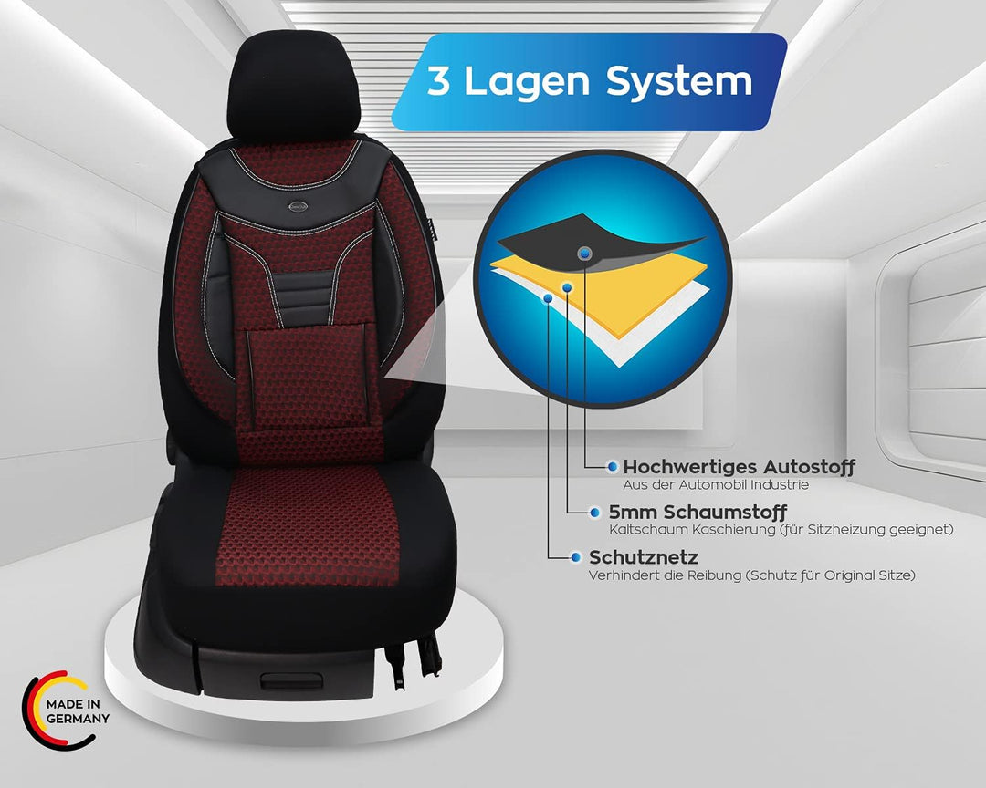- Extras - 3 Lagen System, Sitzbezüge für Airbag und Sitzheizung geeignet, Rückenseite der Vordersitze mit grosszügigen Taschen ausgestattet, komfortables & sportliches Sitzgefühl