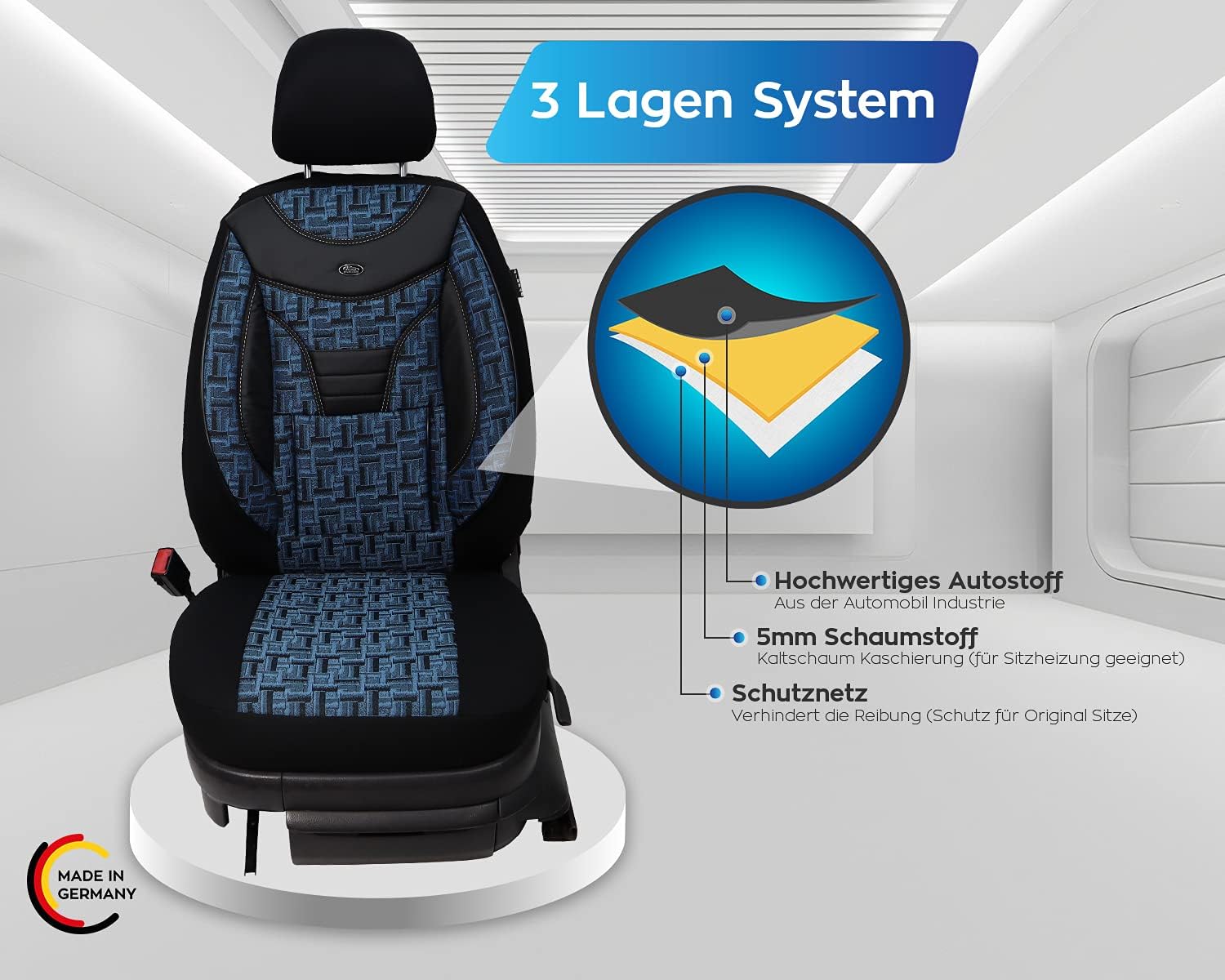 • Merkmale - Mass Anfertigung für Fahrer und Beifahrer, Passend auch für Aktivkopfstützen (nicht abnehmbare Kopfstützen), Fertigung Made in Germany