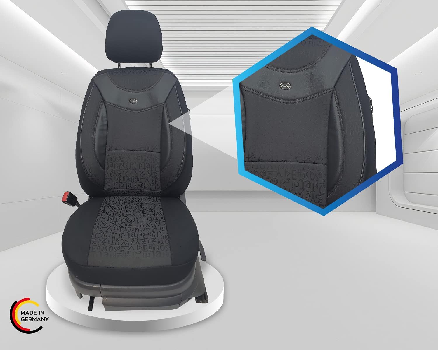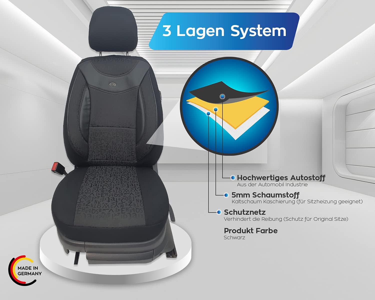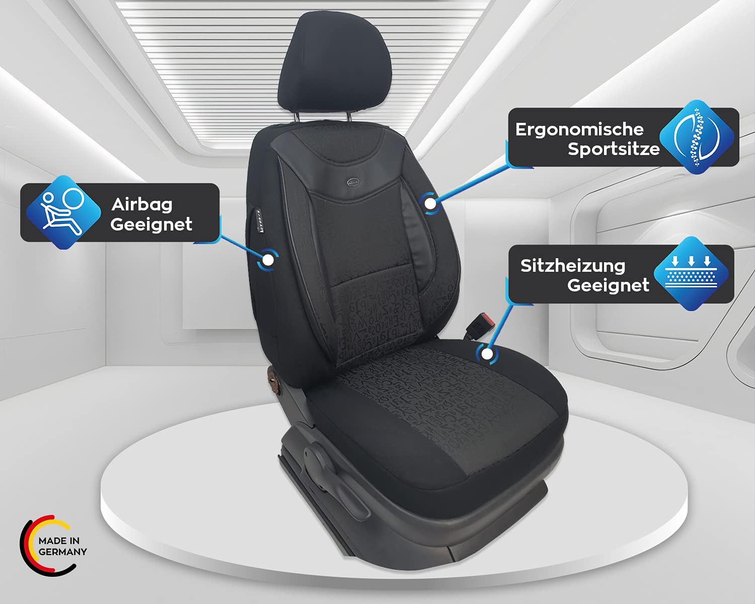 - Merkmale - Mass Anfertigung für Fahrer und Beifahrer, Passend auch für Aktivkopfstützen (nicht abnehmbare Kopfstützen), Fertigung Made in Germany