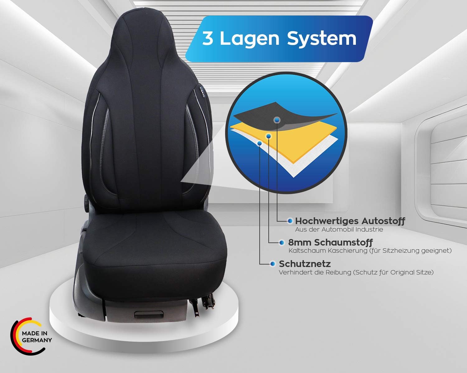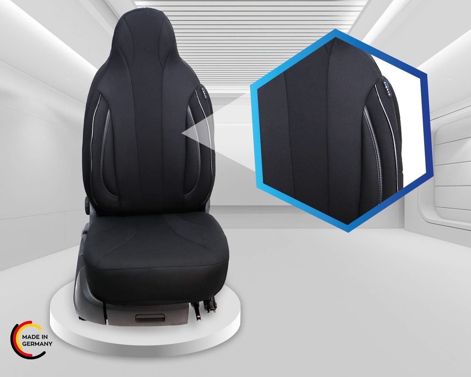 • Merkmale - Mass Anfertigung für Fahrer und Beifahrer, Passend auch für Aktivkopfstützen (nicht abnehmbare Kopfstützen), Fertigung Made in Germany