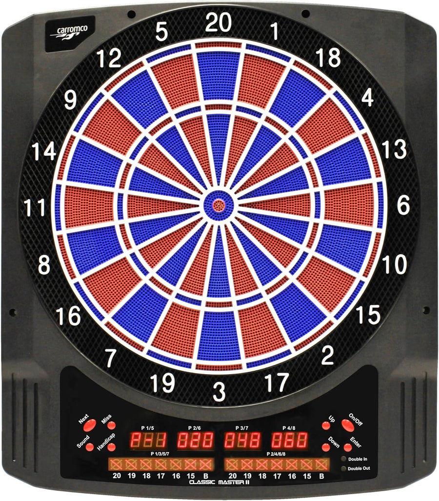 - KLASSISCHES DESIGN: Die elektrische Dartscheibe mit 2 Loch Segmenten in blau-rot und weisser Spinne, verfügt über grosse Cricket Anzeigen mit Kreis/Kreuz Symbolik