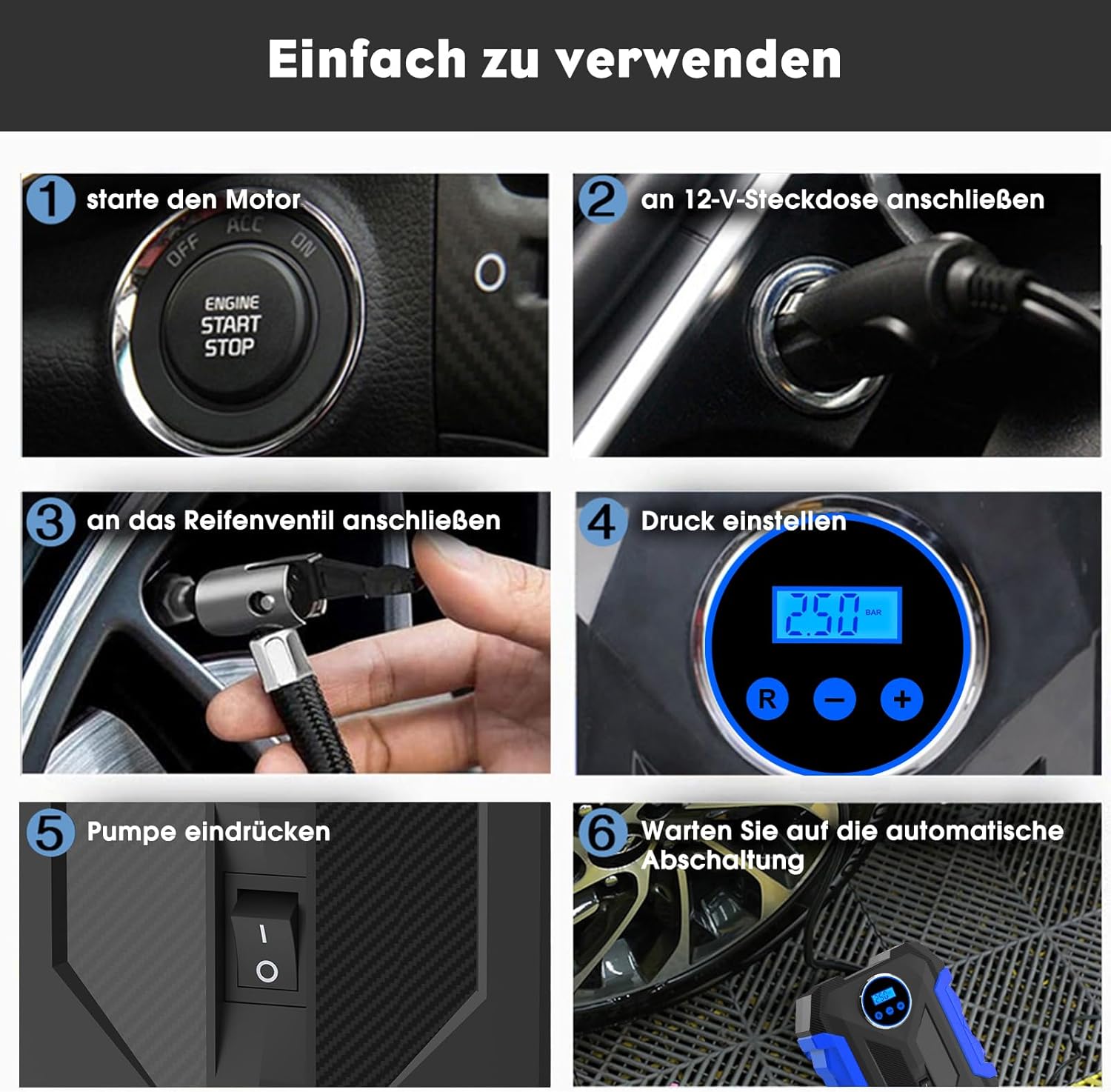 - [EINFACHE BEDIENUNG & AUTOMATISCHE ABSCHALTUNG]: Schliessen Sie das Netzkabel des tragbaren CARSUN-Luftkompressors an die 12-V-Steckdose des Autos an und drücken Sie dann die Aufblasdüse in das Reifenventil. Stellen Sie den für den Reifen