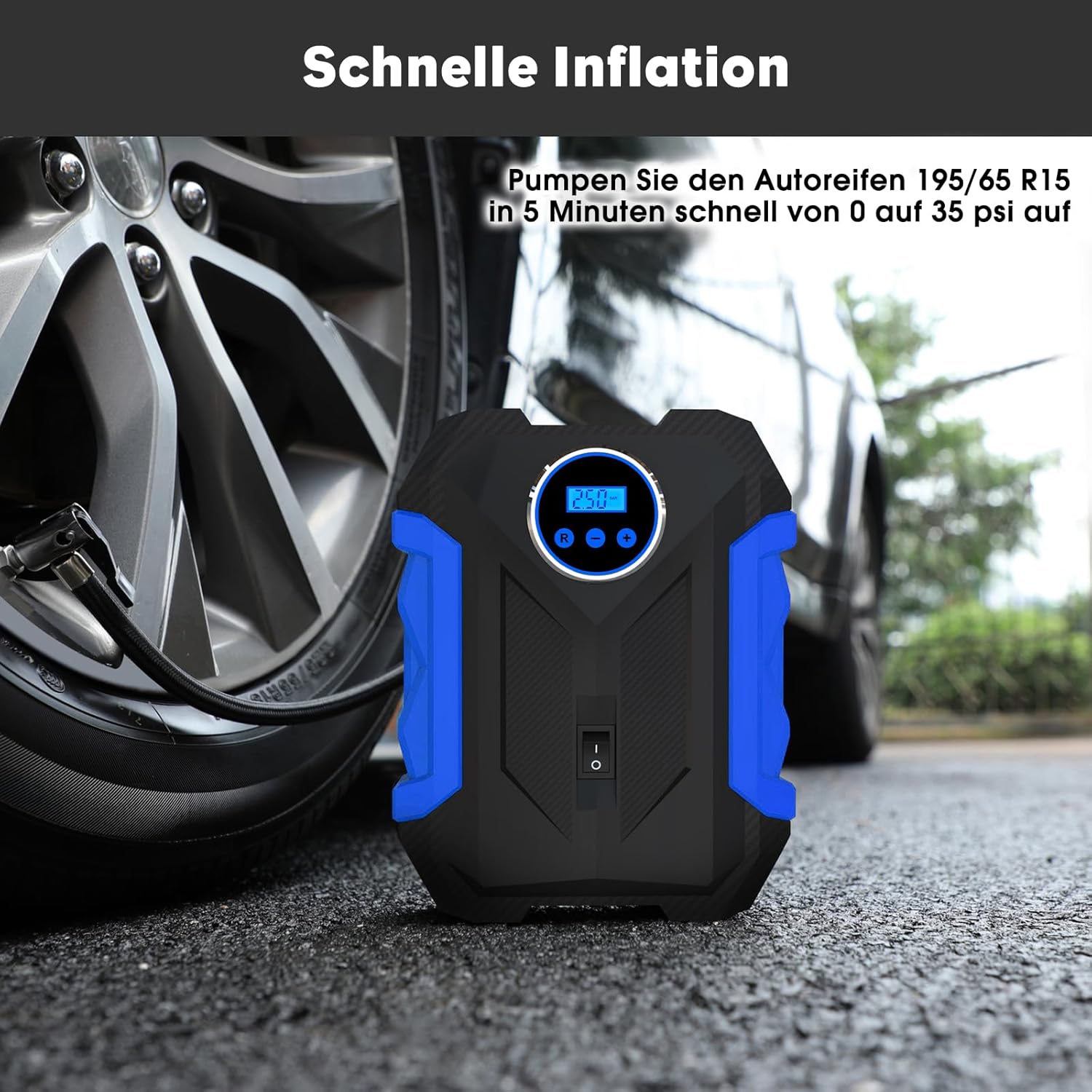 - [150 PSI MAX ARBEITSDRUCK]: Der maximale Druck der Autoreifenpumpe beträgt 150 PSI und der Luftstrom beträgt 35 l / min. Es kann den Autoreifen 195/65/R15 in weniger als 5 Minuten von 0 auf 35 psi aufpumpen. Es ist effizienter und schneller als