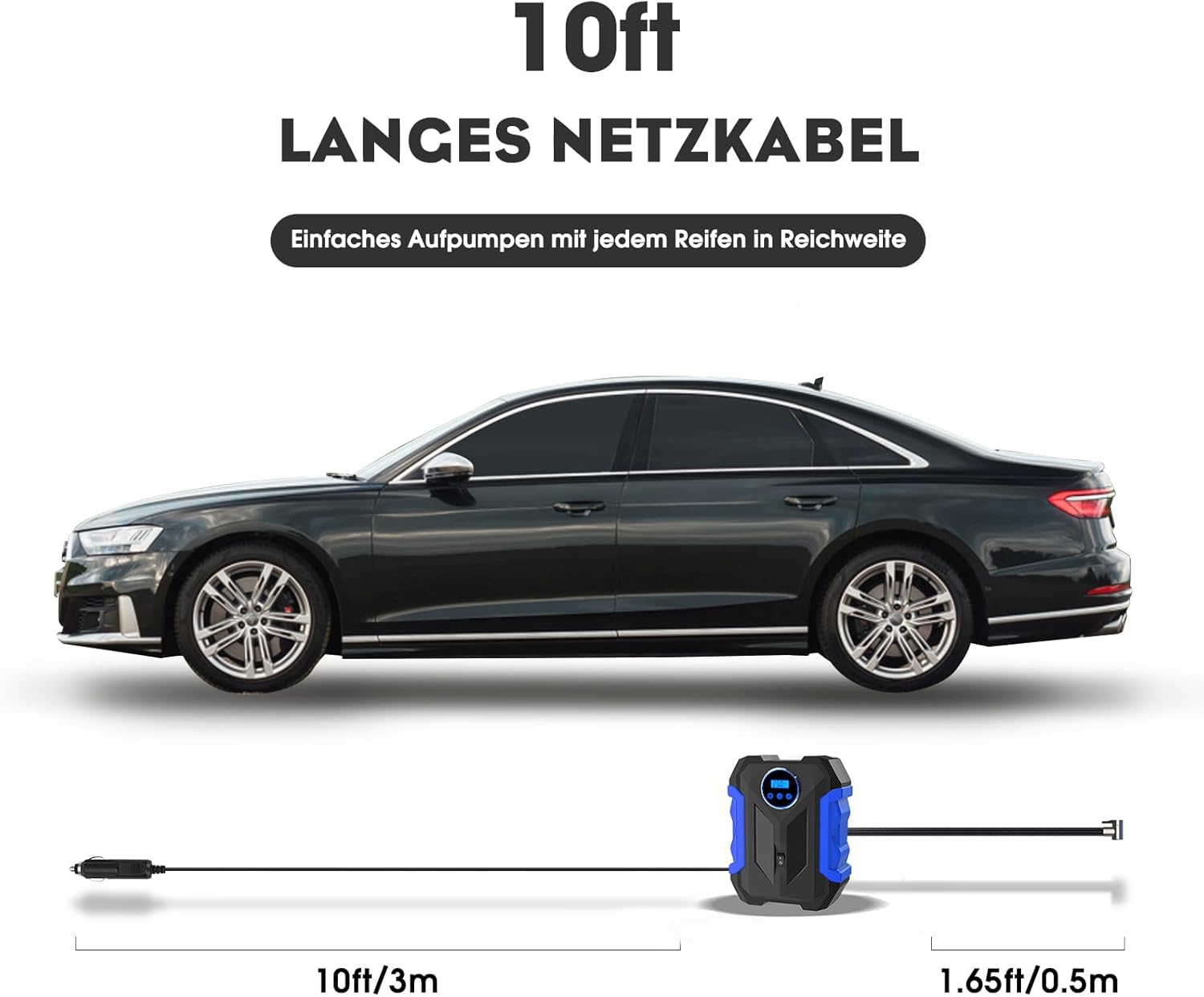 - [MEHRZWECK]: Die Carsun-Luftkompressorpumpe verfügt über ein 3 Meter langes Netzkabel und aufblasbare Adapter (4 zusätzliche Düsen). Sie können nicht nur alle Reifen Ihres Autos, Fahrrads, Motors, ATVs, kompakten oder mittelgrossen Limousinen, SUVs