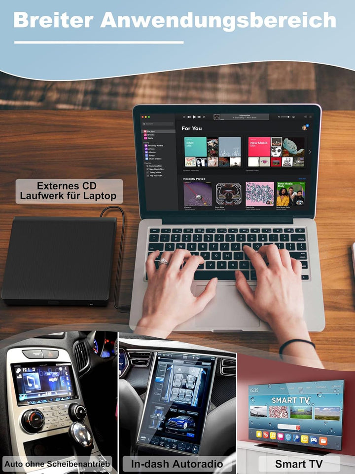 - Nicht nur für Autos: Externer CD Spieler für Auto mit USB Anschluss kann nicht nur in Autos funktioniert, sondern auch als externes CD Laufwerk für Laptop an TV, Computer und mehr angeschlossen werden. Sehr leistungsstarke Kompatibilität! Die am