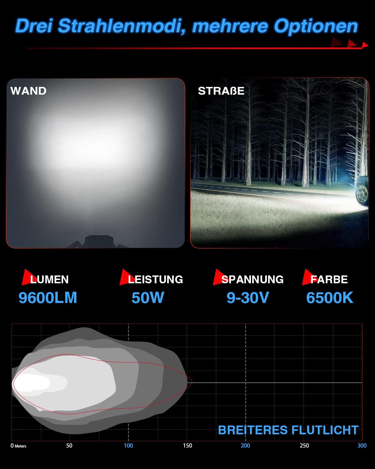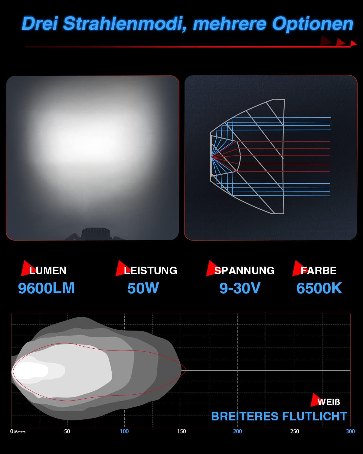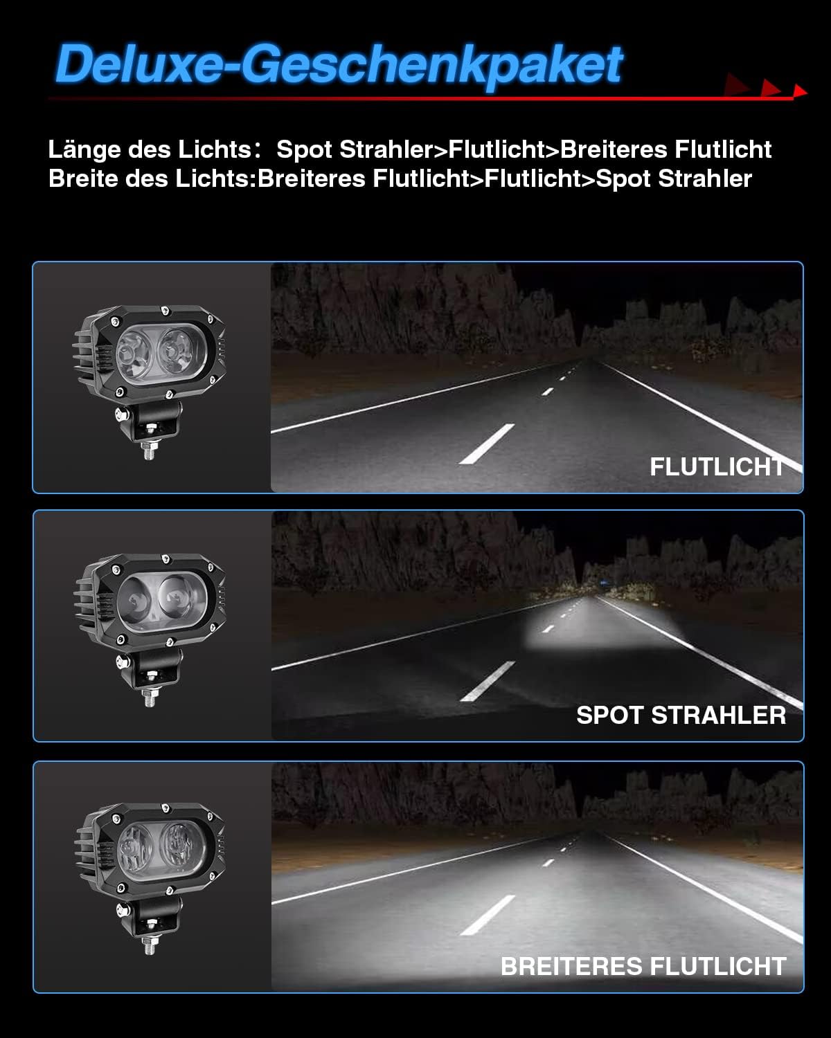 - 【Breites Flutlicht】Wir haben das ursprüngliche Flutlicht aufgerüstet, um den Bestrahlungsbereich weiter zu erweitern. Das helle und breite kaltweisse Licht lässt Sie Hindernisse auf beiden Seiten während der Fahrt rechtzeitig erkennen