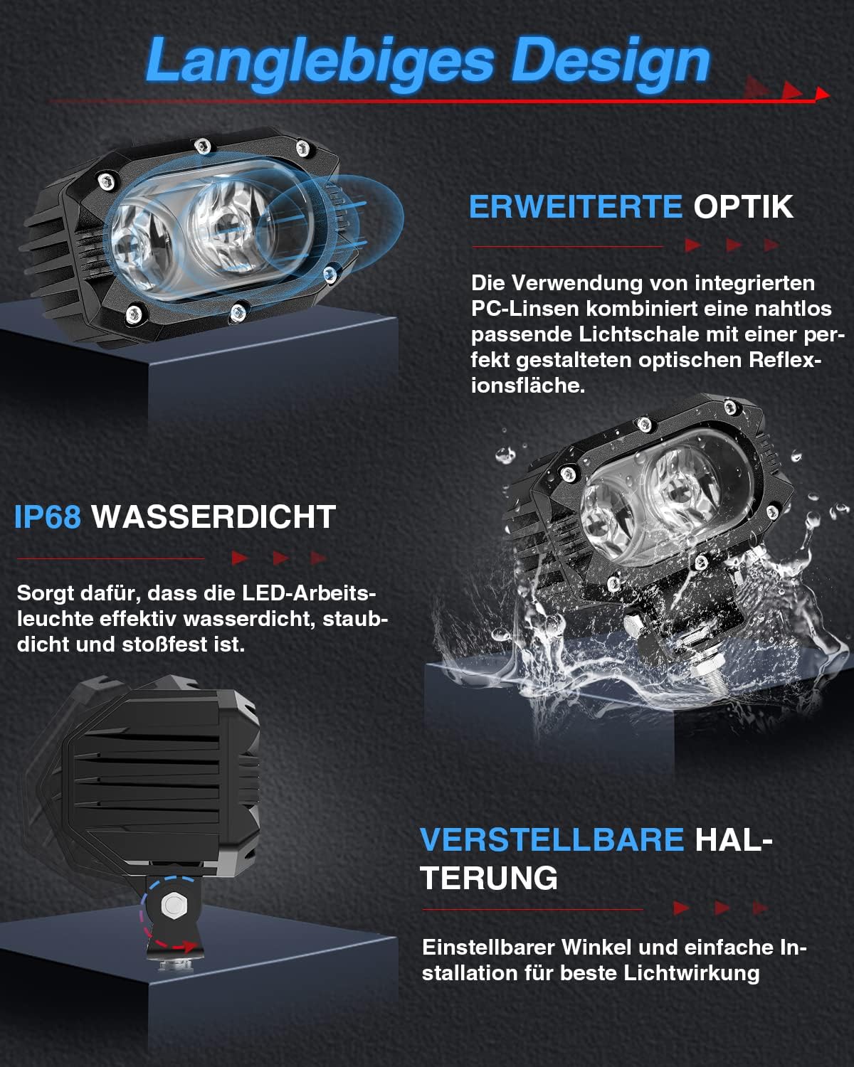 - 【Wasserdicht nach IP68】 Alle Leuchten sind werkseitig wasserdicht nach IP68 und mit hochwertigem Aluminiumgehäuse getestet, was bedeutet, dass unser Zusatzscheinwerfer Auto eine hervorragende wasserdichte, staubdichte, verschleissfestere und