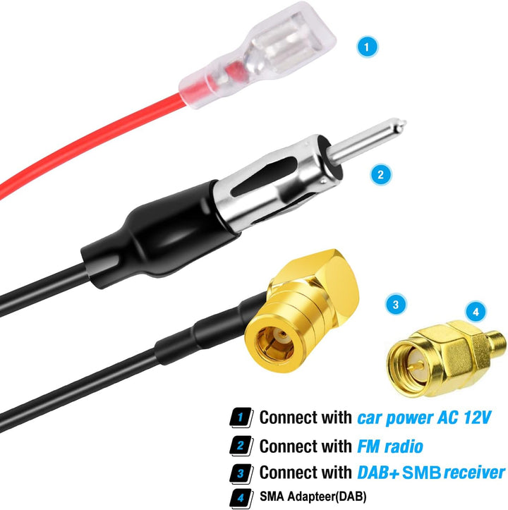 - Kompatibel & Paket: Kompatibel mit den meisten Autos mit FM- und DAB-Ausgang. 1x DAB-Splitter-Antenne (SMA-Adapter + SMB-Stecker + DIN-Stecker + Stromversorgungskabel für geschaltetes 12V mit Kabelschuh)