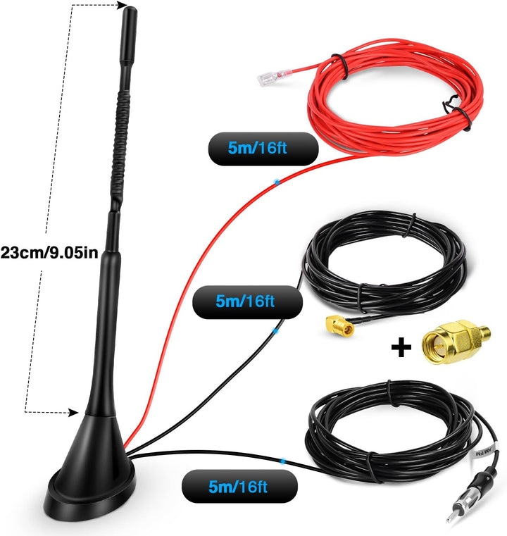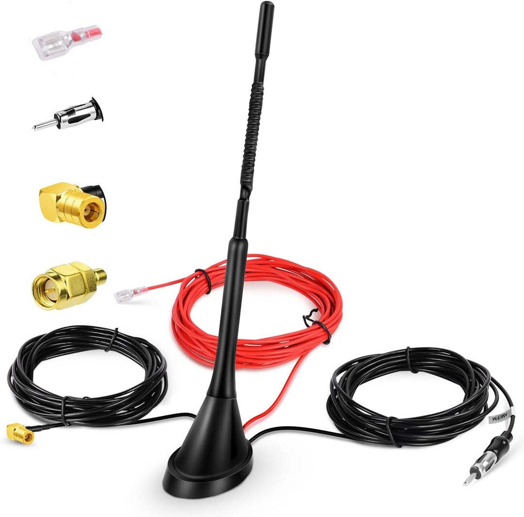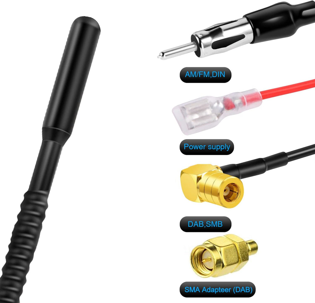 - Kabellänge: Das lange 5-Meter-Kabel mit SMB (DAB)-Anschluss/DIN (AM/FM)-Anschluss ermöglicht es Ihnen, die Antenne fast überall in Ihrem Auto zu installieren. Dies ist ideal, wenn Sie die Originalantenne verloren oder beschädigt haben oder wenn Sie