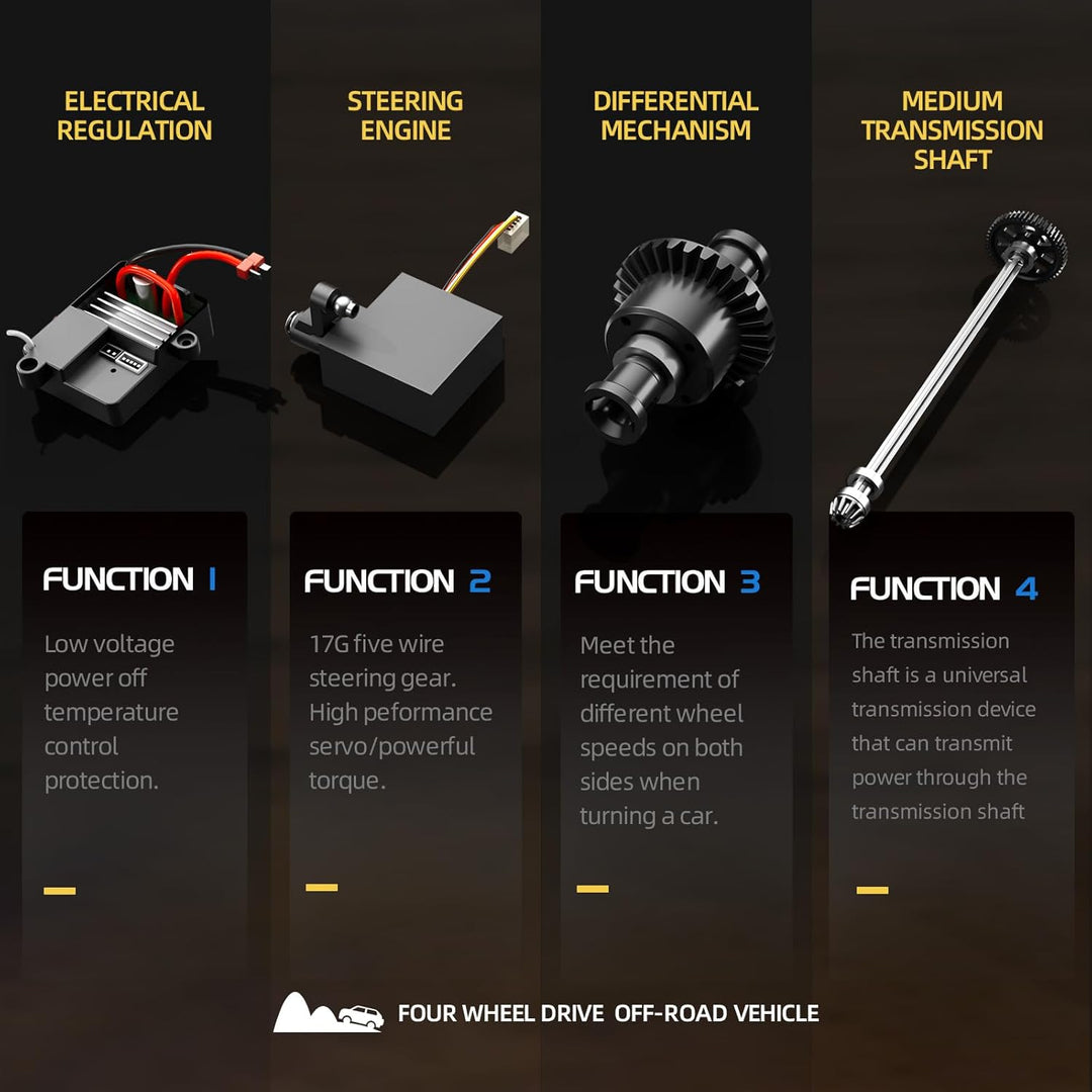 - "Professionelle Offroad-Leistung für Hobbysportler" Allrad-Antrieb (Stahlwellenantrieb / Metall-Differential / Unabhängige Federung / Doppelte Stossdämpfer) + tiefe, breite Reifenprofil, die selbst härtesten Pisten, Schlamm, Gras und Sand bezwingen.