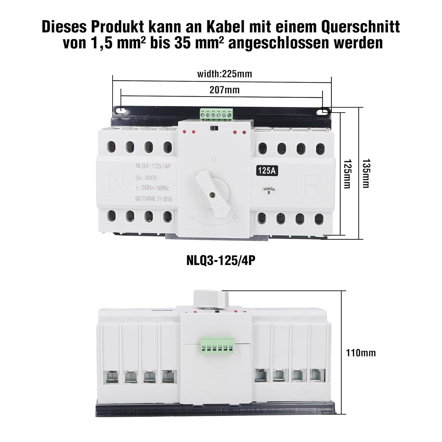 - VORSICHTSMASSNAHMEN: Der Transferschalter wird mit einer 125mm Schiene geliefert, die mit Schrauben am Verteilerkasten befestigt werden muss, nicht geeignet für Standard 35mm DIN Schienen. Bitte achten Sie auf die Grösse Ihres Verteilerkastens. Wenn Sie Fragen zum Produkt haben, können Sie sich vorab an uns wenden, um eine Kaufentscheidung zu treffen.