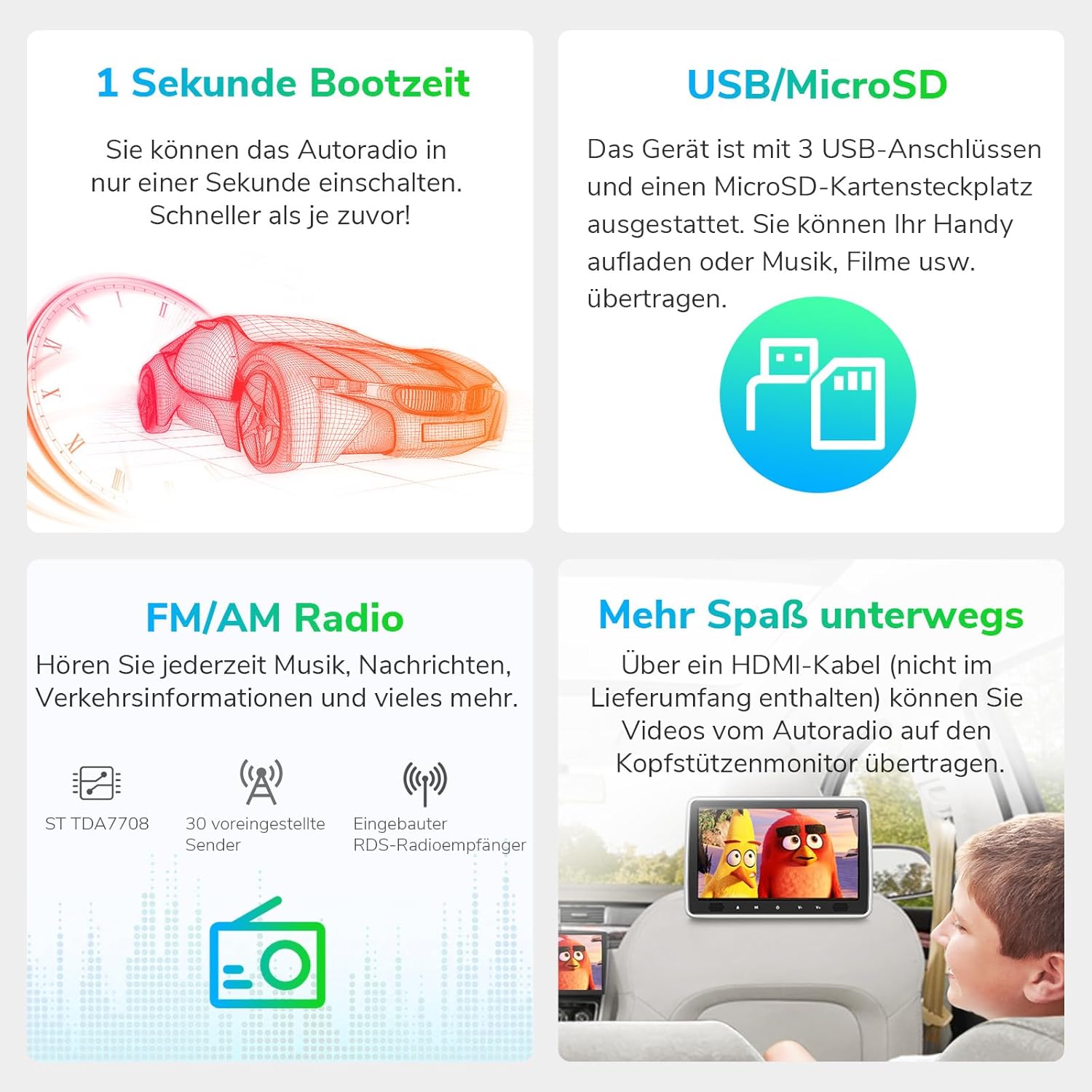 - 9“-QLED-Display & RDS-Radio❌ Das Eonon-Radio verfügt über einen 2,5D-Multitouch-Bildschirm mit 1280*720P HD-Auflösung und 178° vollem Betrachtungswinkel. Die Farbwiedergabe ist realistischer, satter und detaillierter. Das AM/FM-Radio unterstützt