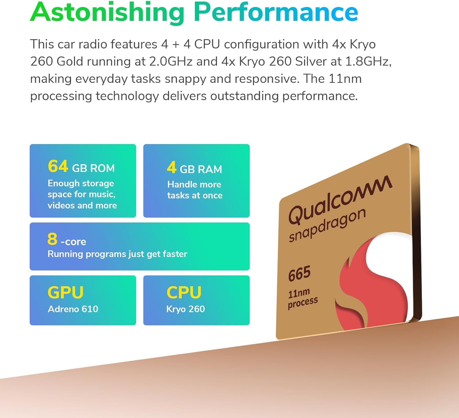- Top-Konfiguration❌ Eonons neuestes Autoradio VWA12S, mit echtes Android 12-Betriebssystem, Snapdragon 665-Prozessor, Octa-Core CPU, 6 GB RAM, 64 GB ROM. Dank der fortschrittlichen 11 nm-Chiptechnologie läuft das Radio reibungsloser und bietet eine