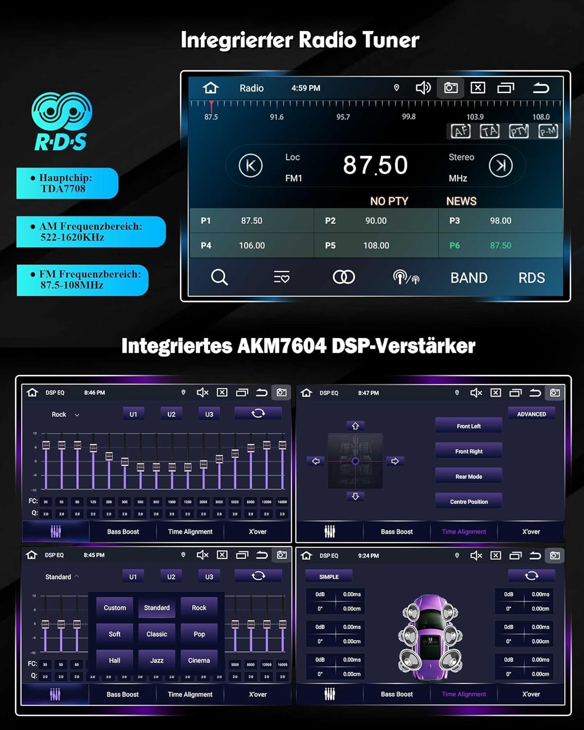 - đăWireless CarPlay & Android Auto & DSP-VerstĂ€rkeră Schliessen Sie einfach ein iPhone (ĂŒber BT) oder ein Android-Smartphone (ĂŒber BT/USB) an dieses Radio an, dann können Sie ganz einfach telefonieren, Nachrichten senden und empfangen, Musik