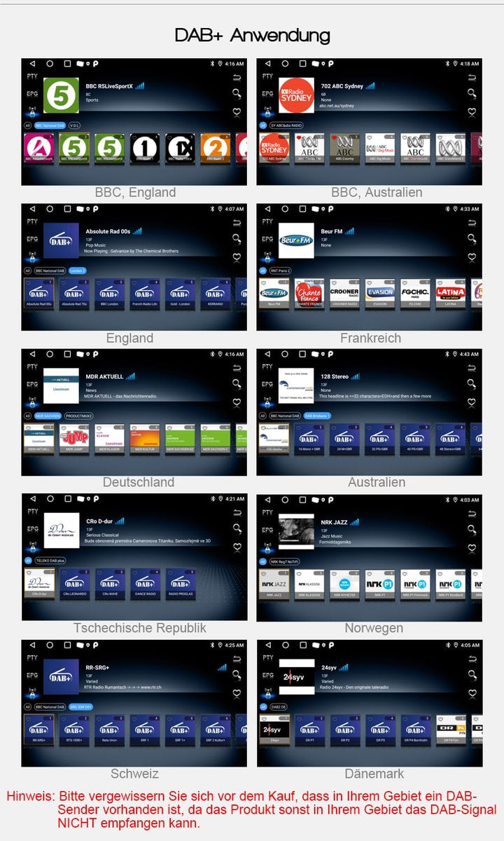 - *【Digital Audio Broadcasting】DAB+ hat nach und nach den traditionellen analogen Roadcast AM/FM abgelöst. Digital Audio Broadcasting ermöglicht Ihnen überregionale Musik mit Ihren lokalen bekannten und auch neuen Sendern. CD-Klangqualität und