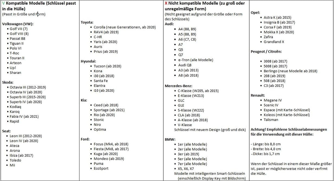 - ✅ FÜR ALLE AUTOMARKEN - Geeignet für alle gängigen Keyless-Go und Keyless-Entry-Schlüssel. Es passen alle Autoschlüssel mit eine Grösse von maximal 81x41x19mm