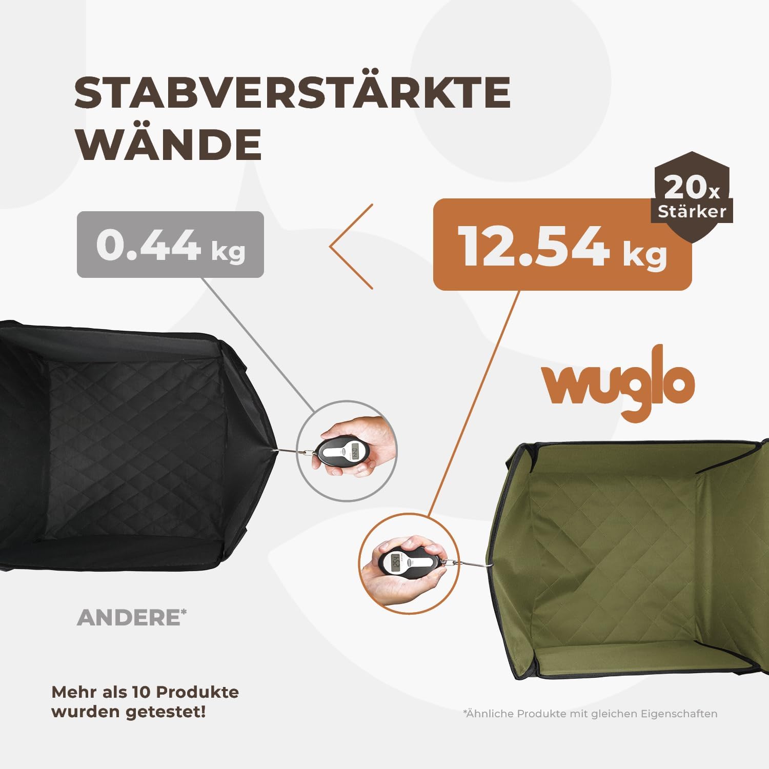 - 20-MAL STÄRKERE WÄNDE - Herkömmliche Hundesitz Körbe haben schwache Wände. Aus diesem Grund haben wir von Wuglo bei der Herstellung unseres Hunde Auto Sitzes besonders stabile Glasfaserstäbe und Kunststoffplatten integriert!