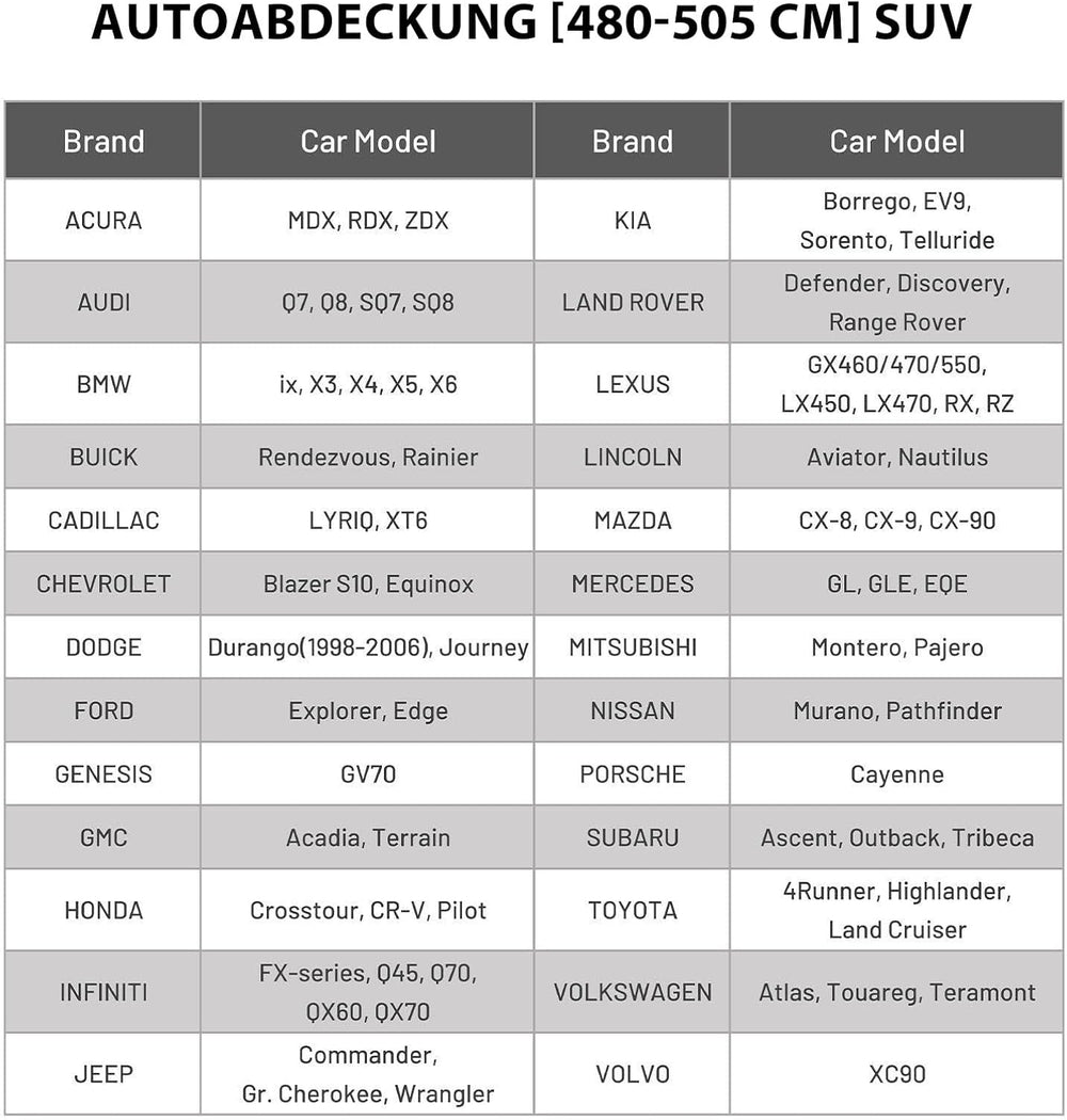 - 【Universal Grösse】- Die Favoto Auto Vollgarage für ganze Saison passt für alle SUV mit Länge(480 - 505 cm / 505cm x 195cm x 175cm ) . Es gibt eine Aufbewahrungstasche in Lieferumfang. Sie können die Autohülle einfach zusammenklappen und in den