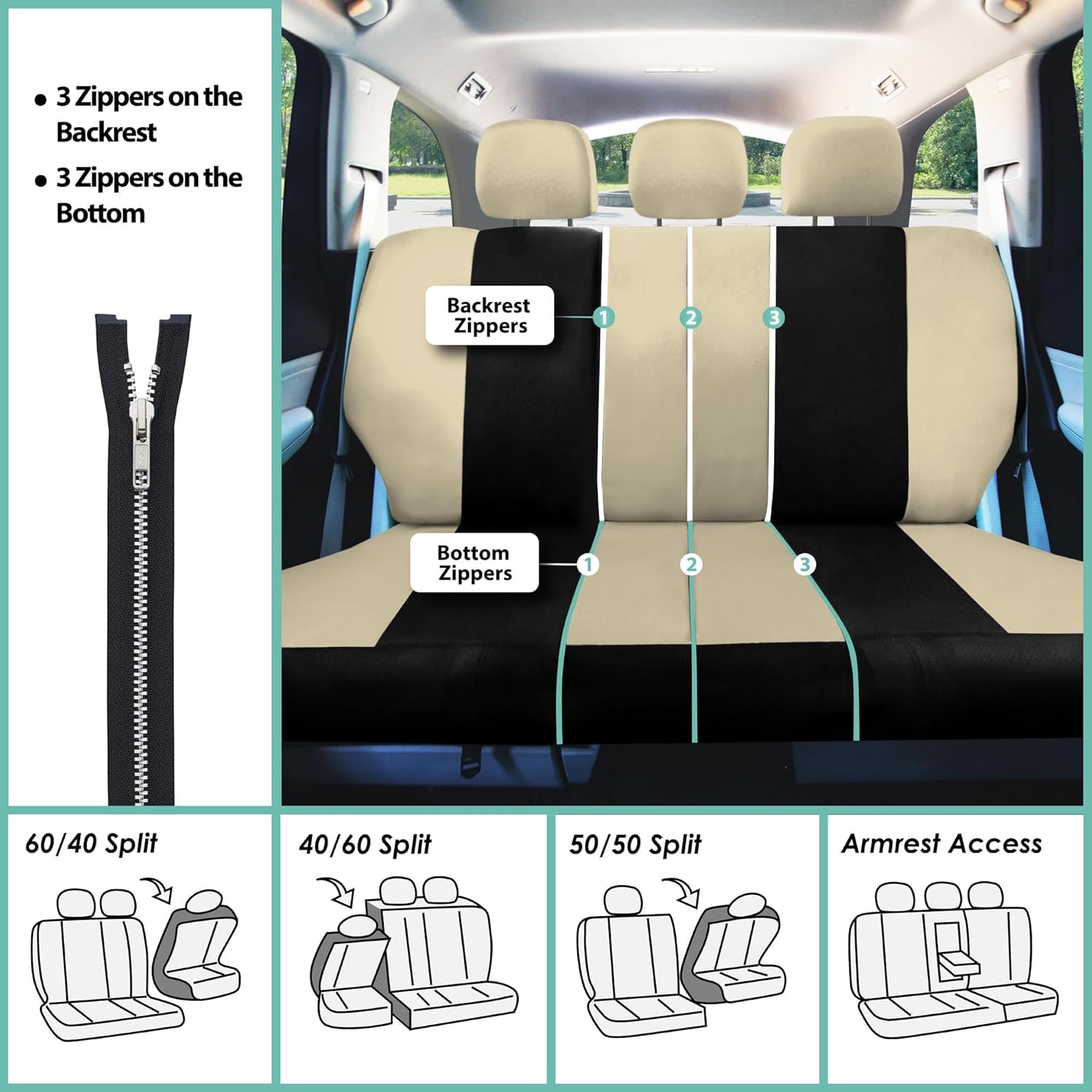 - Kompatibel mit geteilten Rücksitzbank: Unsere Rücksitzbezüge sind voll kompatibel mit 50/50, 40/60, oder 60/40 geteilten Bänken (oder längeren Bänken). Die Bezüge verfügen über 3 Reissverschlüsse in der Rückenlehne und am unteren Deckel und