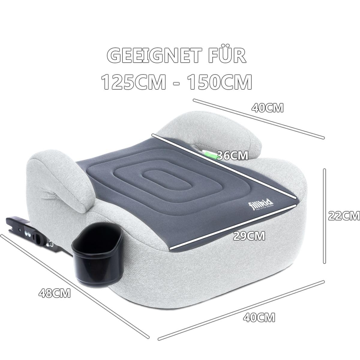 - Masse: 40 x 40 x 22 cm (LxBxH) - Sitzfläche: 29 x 36 cm (LxB) - Neue i-Size Norm ECE R129 - Geeignet für 125 – 150 cm Körpergrösse - Flaschenhalter beidseitig anzubringen - Material Sitzschale HDPE Kunststoff - Abnehmbarer Bezug waschbar bei 30 °C