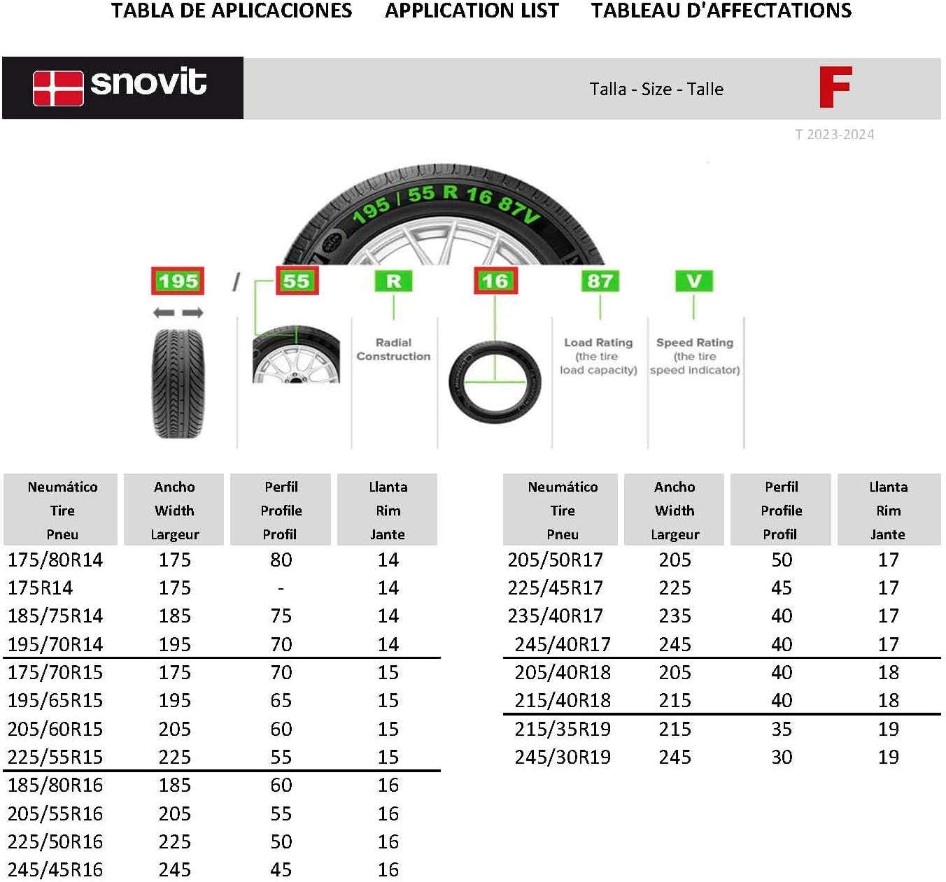 - Grösse F, kompatibel mit Masse: 175/14 175/80/14 185/75/14 195/70/14 175/70/15 195/65/15 205/60/15 225/55/15 205/55/16 225/50/16 245/45/16 205/50/17 225/45/17 245/40/17 255/40/17 215/40/18 255/35/18 215/35/19