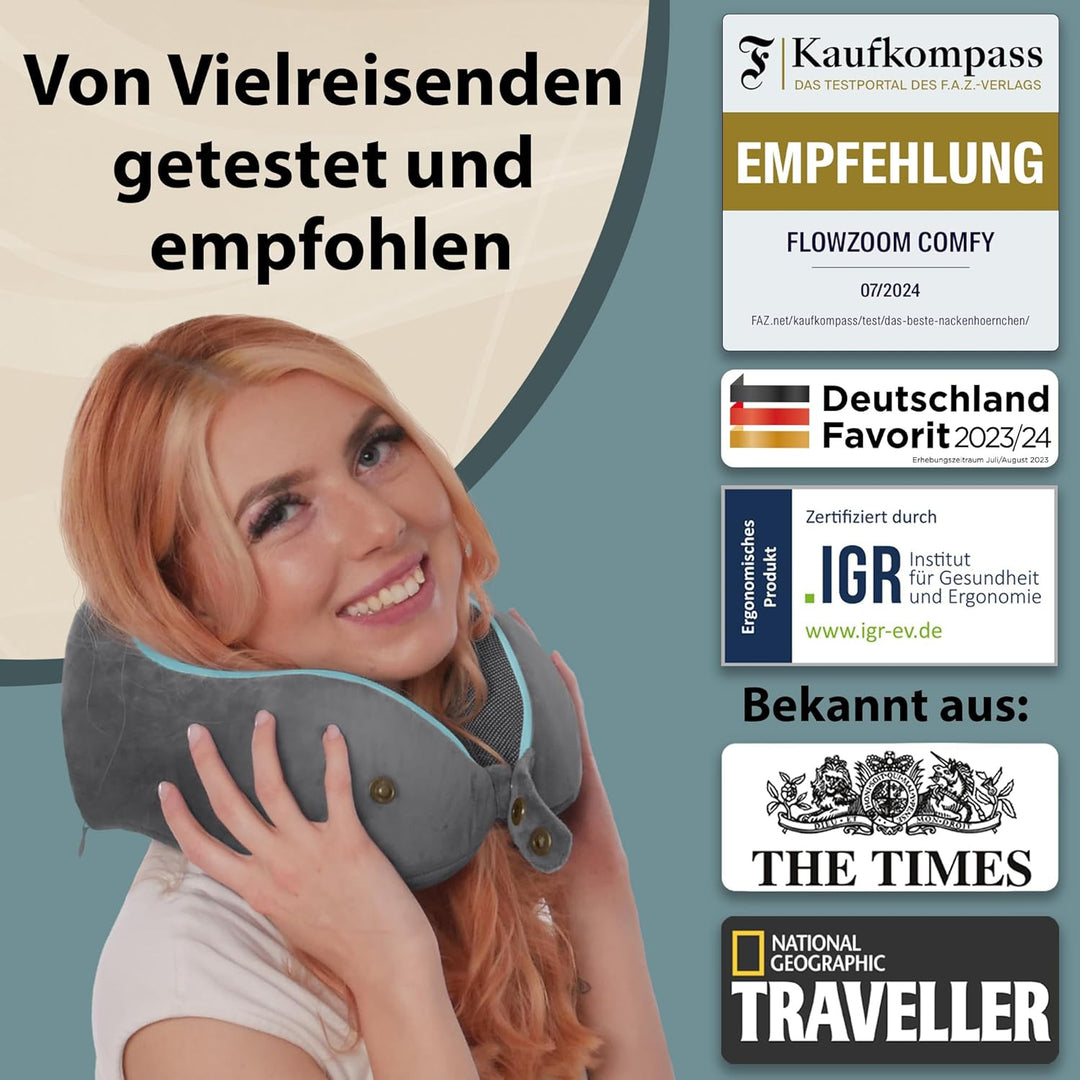 - ๐ซ EINZIGARTIGES DESIGN - Der Kopf wird beim Zurรผcklehnen im Flugzeug, Auto oder Zug dank der extra-schmalen Rรผckseite des Nackenkissen NICHT NACH VORNE GEDRรCKT