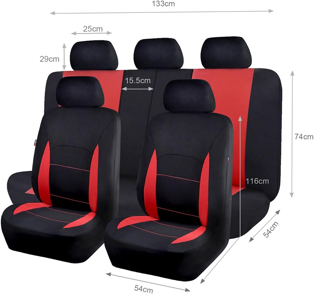 - Komplettset beinhaltet: 2 Vordersitzbezüge, 1 Rückbankbezug, 1 Rückbankunterbezug, 5 separate Kopfstützenbezüge, 1 Packung Haken. (Bitte beachten: die Haken befinden sich im Kopfstützenbezug)