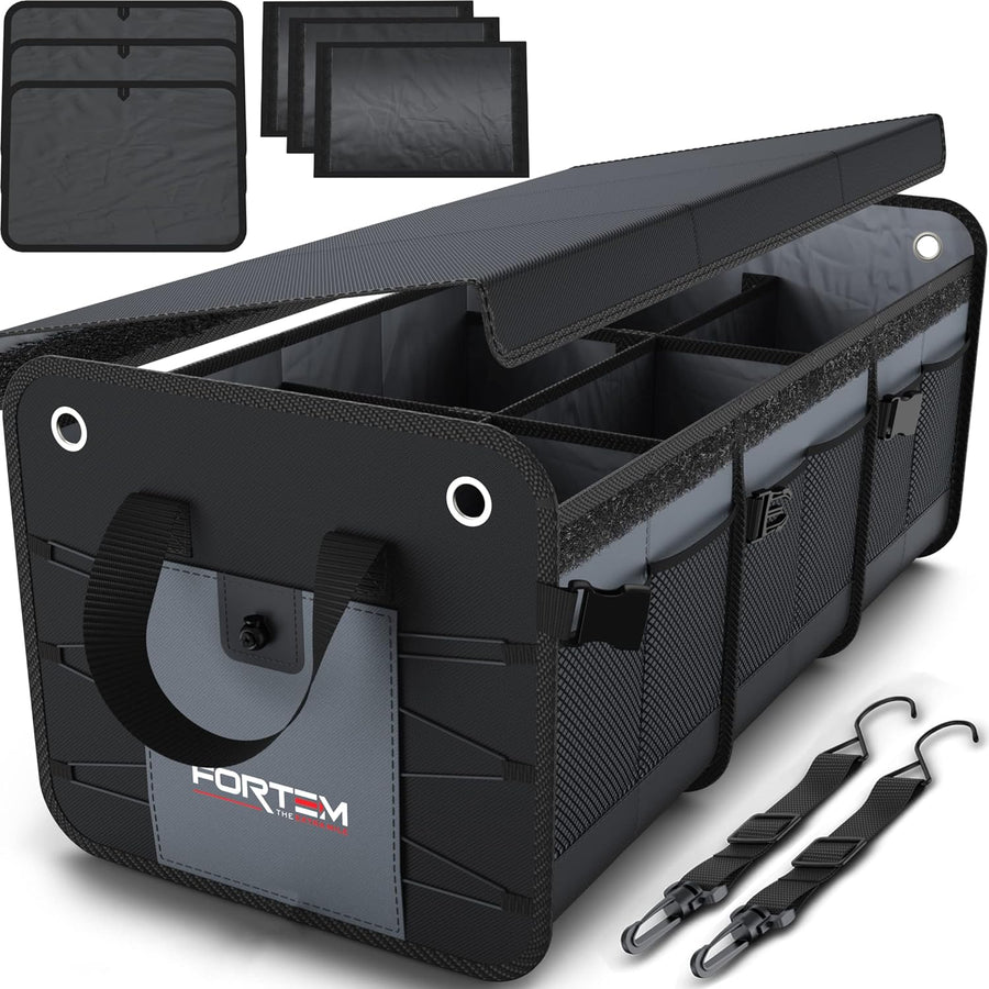 - Robustes Boxendesign - Der Premium Auto Kofferraum Organizer von Fortem ist mit stabilen Bodenplatten ver-stärkt, sodass jede Seitenwand gestützt wird. Unsere Kofferraum Tasche ist die beste unter den Auto Organizer Lösungen und Aufbewahrungsboxen mit mehreren Seitentaschen und bis zu 6 Fächern, sodass Sie das Chaos im Kofferraum beseitigen können. Die untere Hälfte des Organizers ist ausserdem wasserdicht.