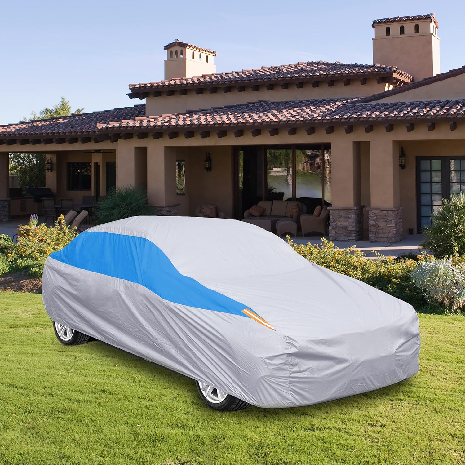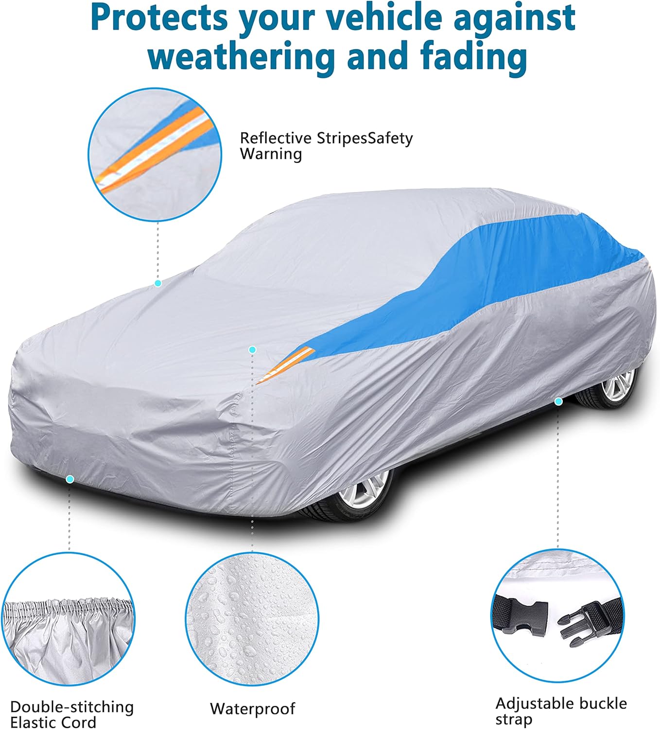 - 【Winddichtes Design】Es gibt elastische Bänder auf der Vorder- und Rückseite + drei Gurte können die Abdeckung Ihres Autos bei starkem Wind schützen, damit sie nicht wegrutscht. Vier reflektierende Streifen, erinnern Sie andere in der Nacht.