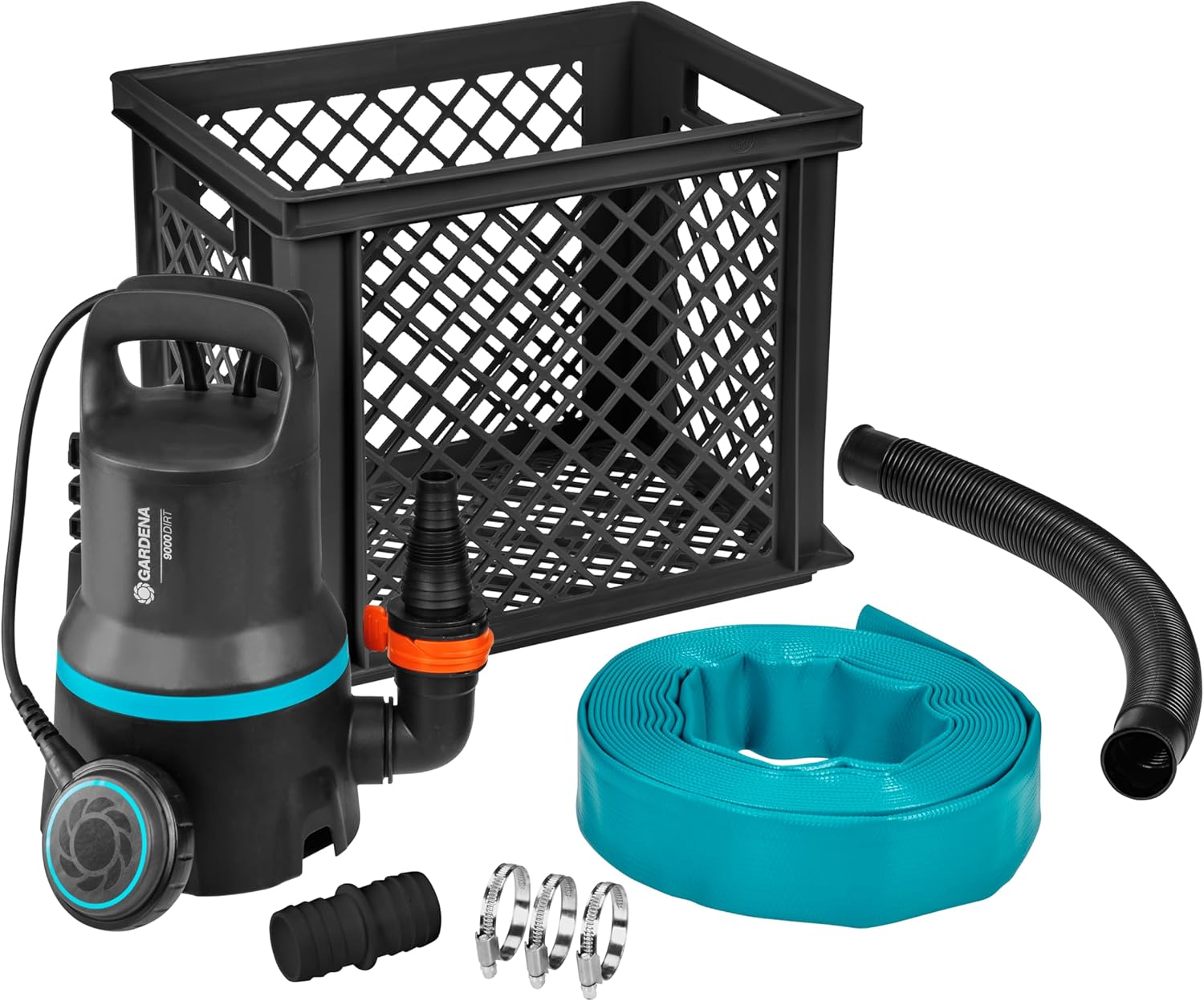 - Lieferumfang: 1x Gardena Hochwasser-Set 9000, 1x 10 m Flachschlauch, 1x 38 mm Schlauchverbinder, 3x Schlauchschelle, 1x 0,5 m Teich-Rippenschlauch 38 mm in einer robusten Aufbewahrungsbox