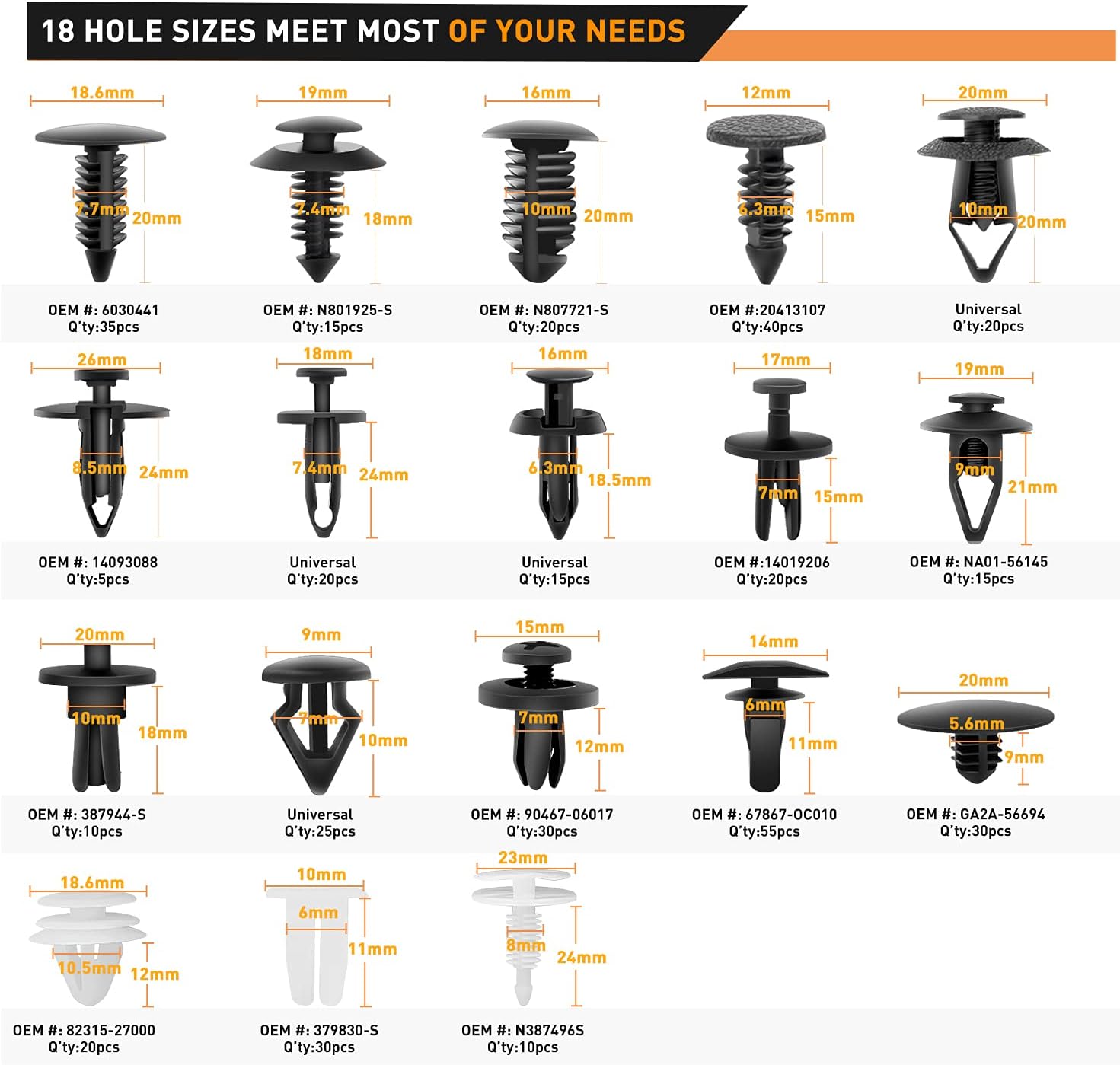- Funktioniert für fast alle Situationen – Das Set enthält 18 Arten der gängigsten Grössen von Befestigungsclips, geeignet für den OEM-Ersatz in 6–10 mm Lochgrössen, damit Sie immer die richtige Grösse haben.