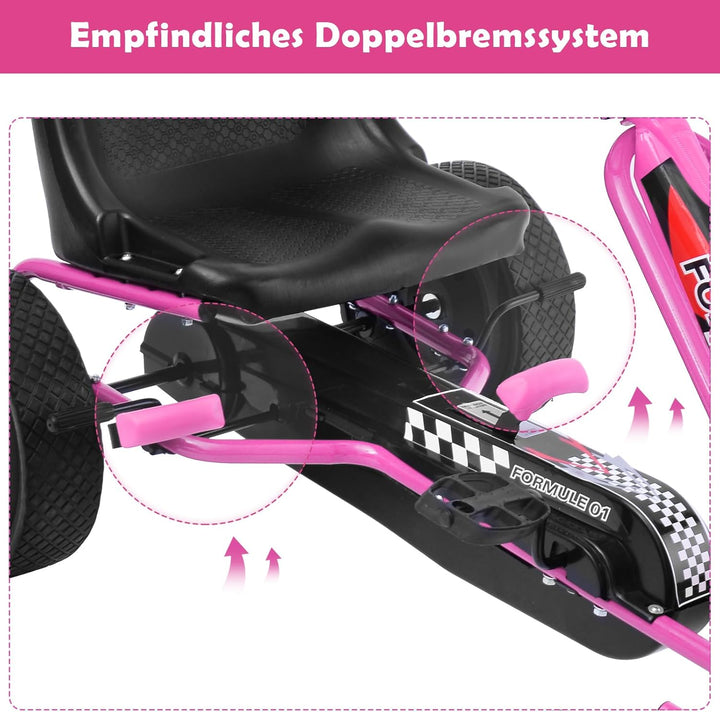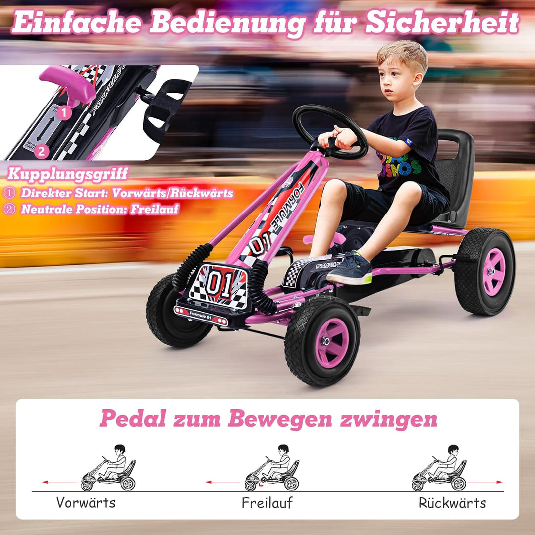 - Mehrere Fahrfunktionen: Dieses Gokart ist voll funktionsfähig und kann vorwärts und rückwärts fahren und sich drehen. Dank der flexiblen Bremse und Kupplung können Sie sicherstellen, dass Ihr Kind rechtzeitig anhalten kann und die Gefahr beim Fahren