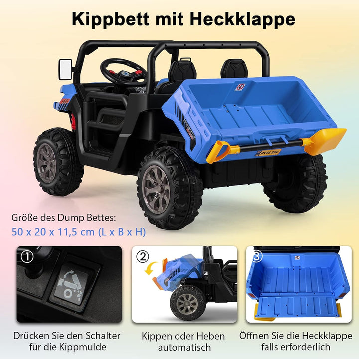 - Kippbett & Schaukelfunktion: Unser Kinderauto im Landhausstil hat ein Kippbett, das Sie ganz einfach nach oben oder unten heben können. Es kommt auch mit einer Schaufel und einer zu öffnenden Heckklappe. Ausserdem verfügt das Auto über eine