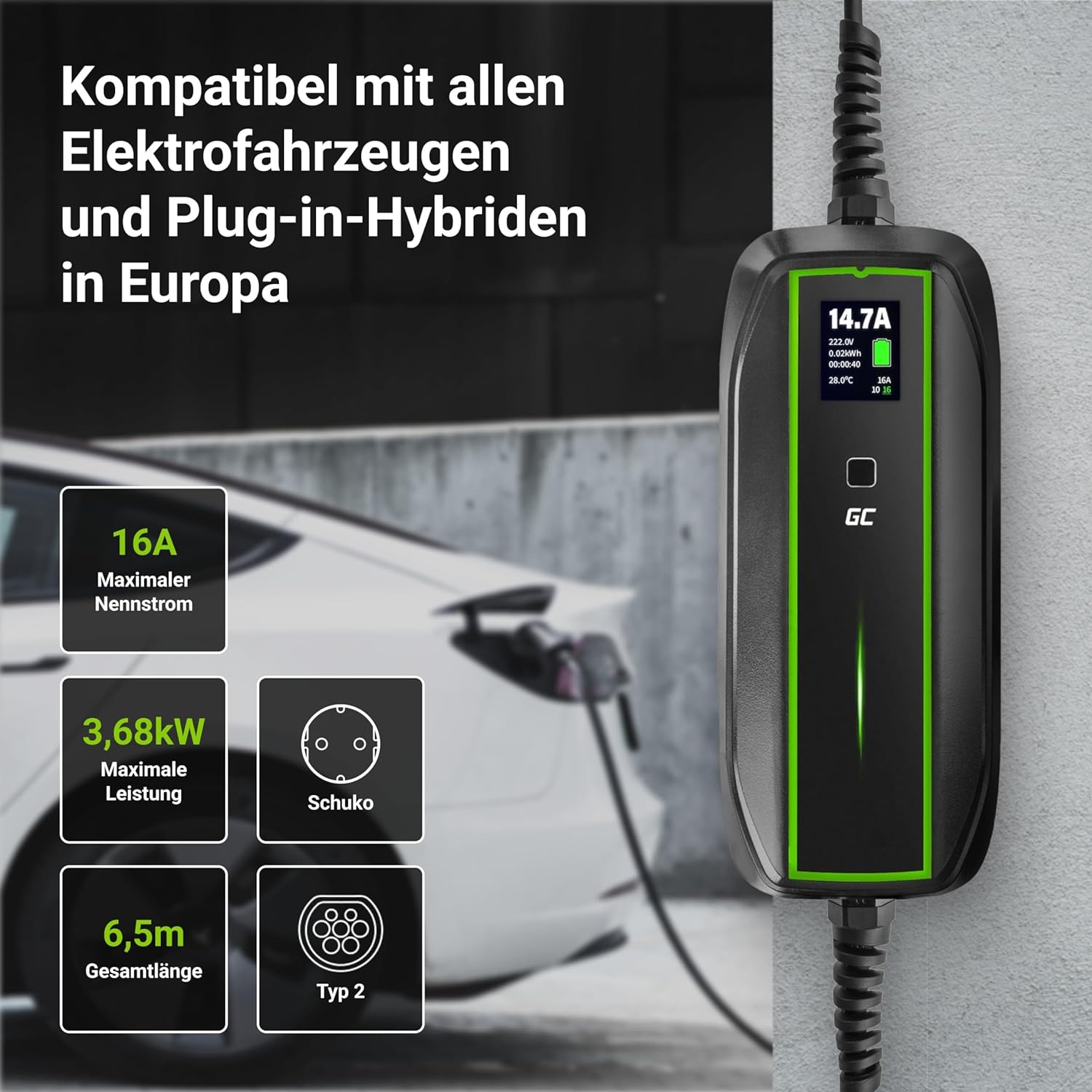 - Lädt alle Elektroautos, mit einer Typ-2-Steckdose, z.B. Model 3 / S / X / Y, i3, i4, iX, ID.3, ID.4, ID.5, E-Tron, EV6, IONIQ 5, Mach-E, EQC, 500e, e-208 und Zoe