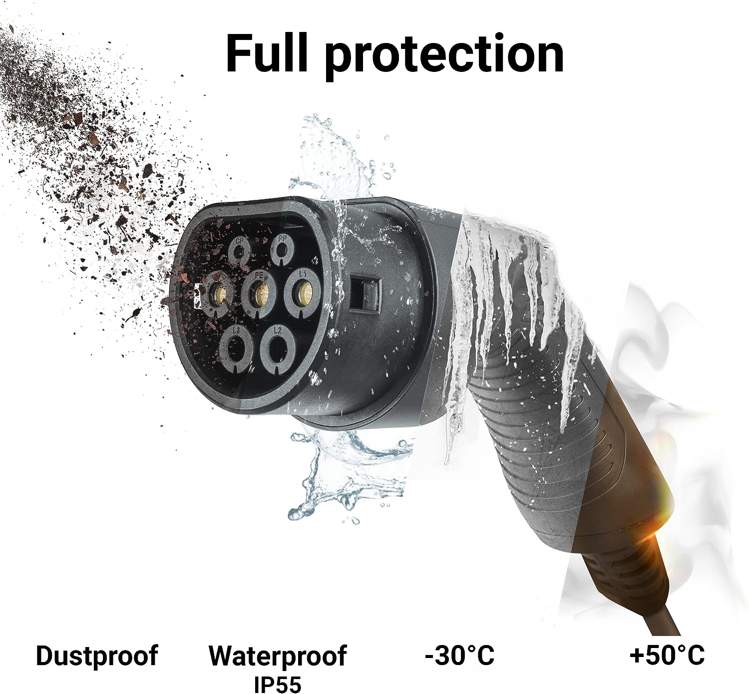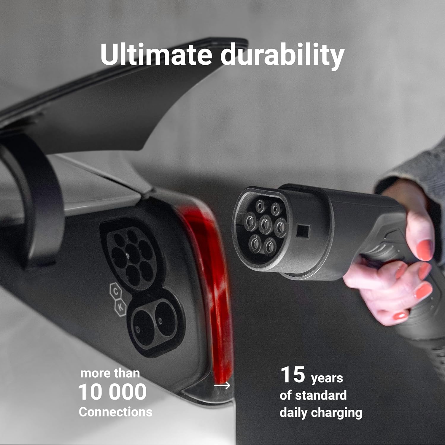 - LANGLEBIGKEIT ÜBER JAHRE | Verstärkte Konstruktion macht das Ladekabel widerstandsfähig gegen Überfahren durch ein Auto (Druck bis zu 2 Tonnen), hat einen hohen Grad an Wasser- und Staubdichtigkeit (IP55-Standard) und eine erhöhte Hitzebeständigkeit
