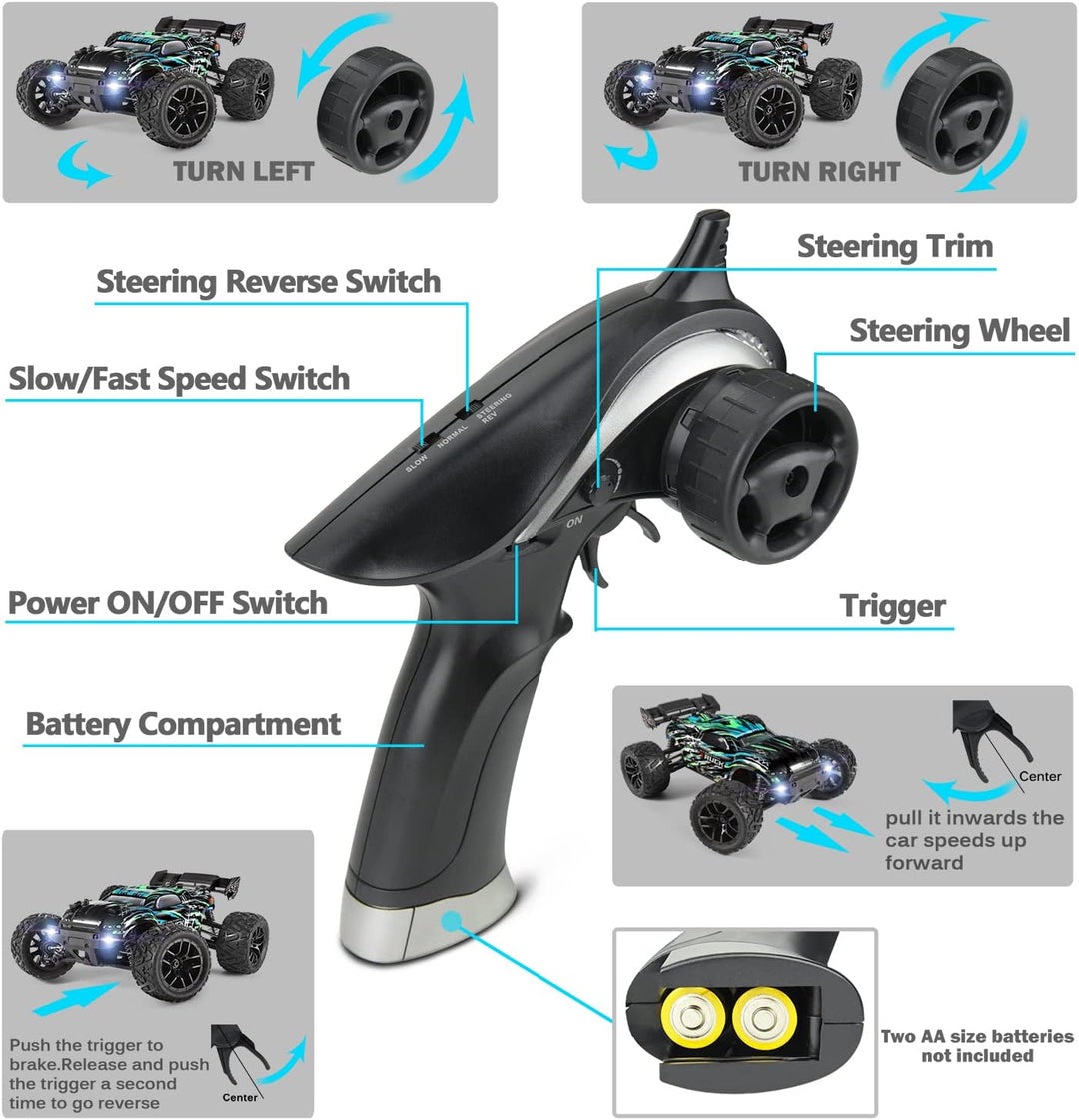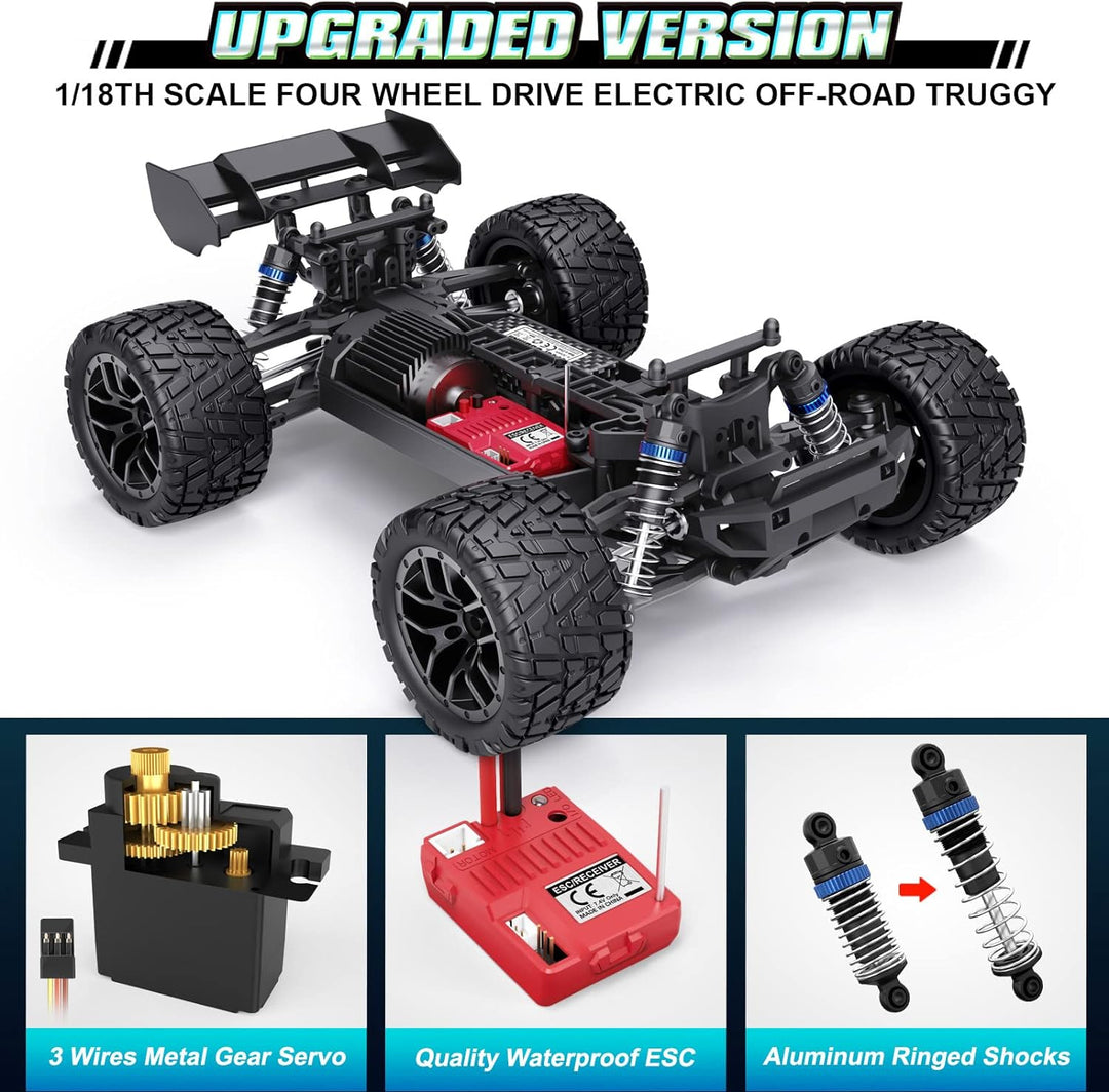 - Neue Version Hobbyist Grade RC Truggy Hailstorm: Verbessertes 4WD-Chassis-Design, Differentiale der Vorder- und Hinterräder sowie Metallantriebswellen machen dieses Auto stabiler und sturzsicherer, wodurch die Auswirkungen verschiedener versehentlicher Stösse wirksam verhindert und das Auto vor Beschädigungen geschützt werden kann. Die starke Antikollisionsstruktur und der Allradantrieb ermöglichen das Fahren auf jeder Strasse, ohne dabei auf grösseren Hindernissen hängen zu bleiben.