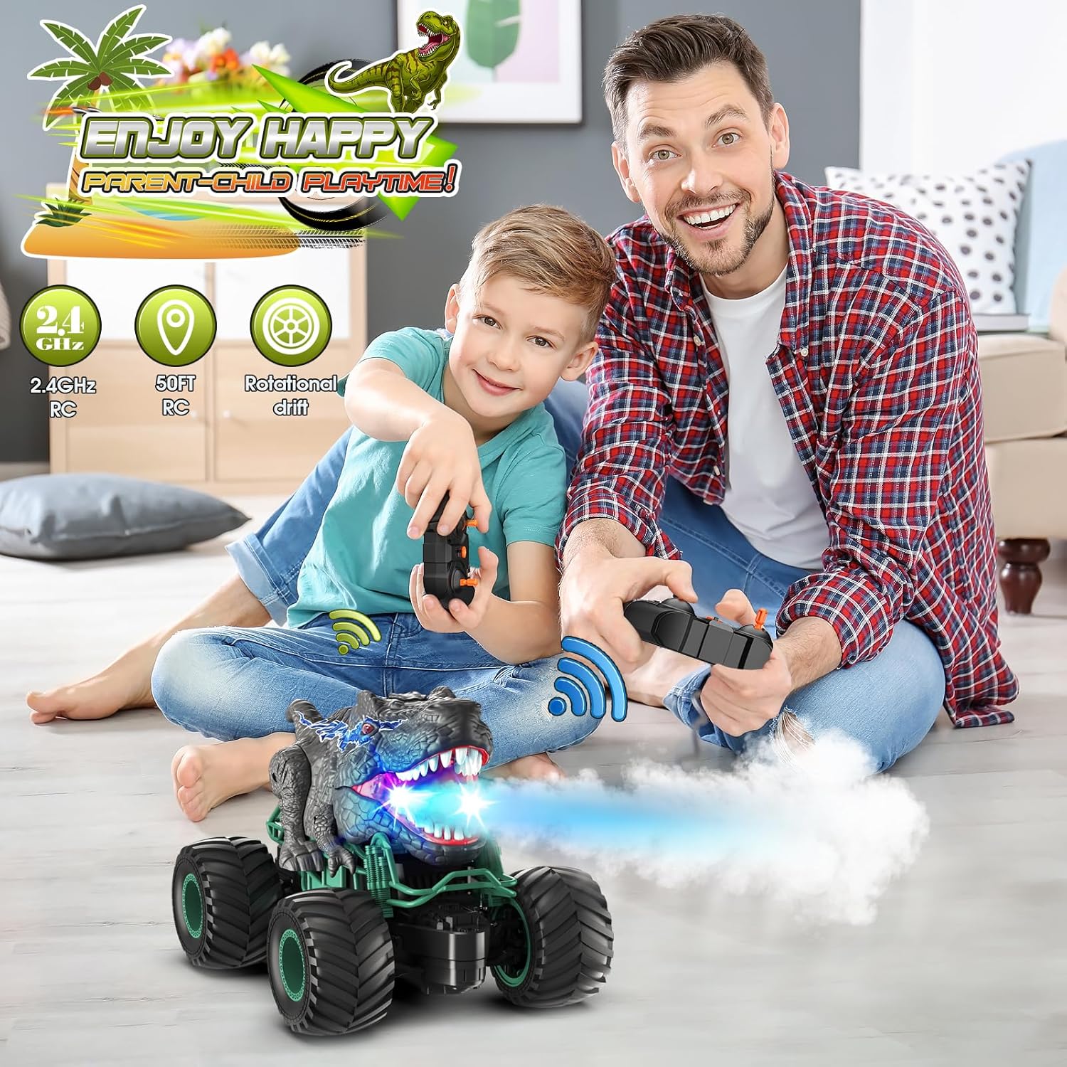 - 🌋LED-LEUCHTEN, DINOSAUR-SOUNDS & SPRAY -- Dieses RC-Dinosaurier-Autospielzeug fährt nicht nur vorwärts/rückwärts und wendet rechts/links wie ein echtes Auto, es hat auch coole Dinosaurier-LED-Blaulichter und brüllende Geräusche und sprüht wie