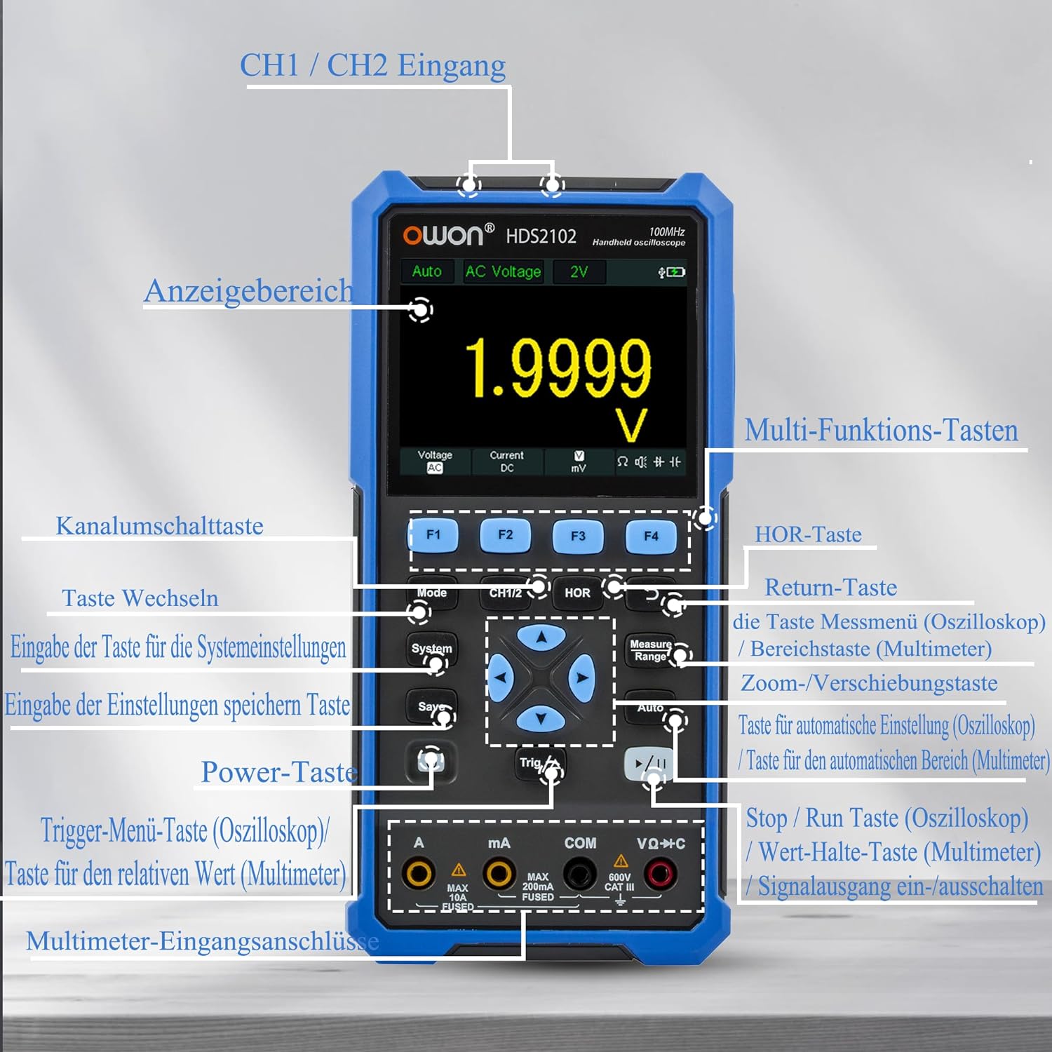 - 2-in-1---2CH digital oscilloscope with 2 in 1 function, portable oscilloscope built-in multimeter is very handy. You can work well done with one device for your jobs or your experiments. At the same time, its detection date is very accurate, 20,000 count