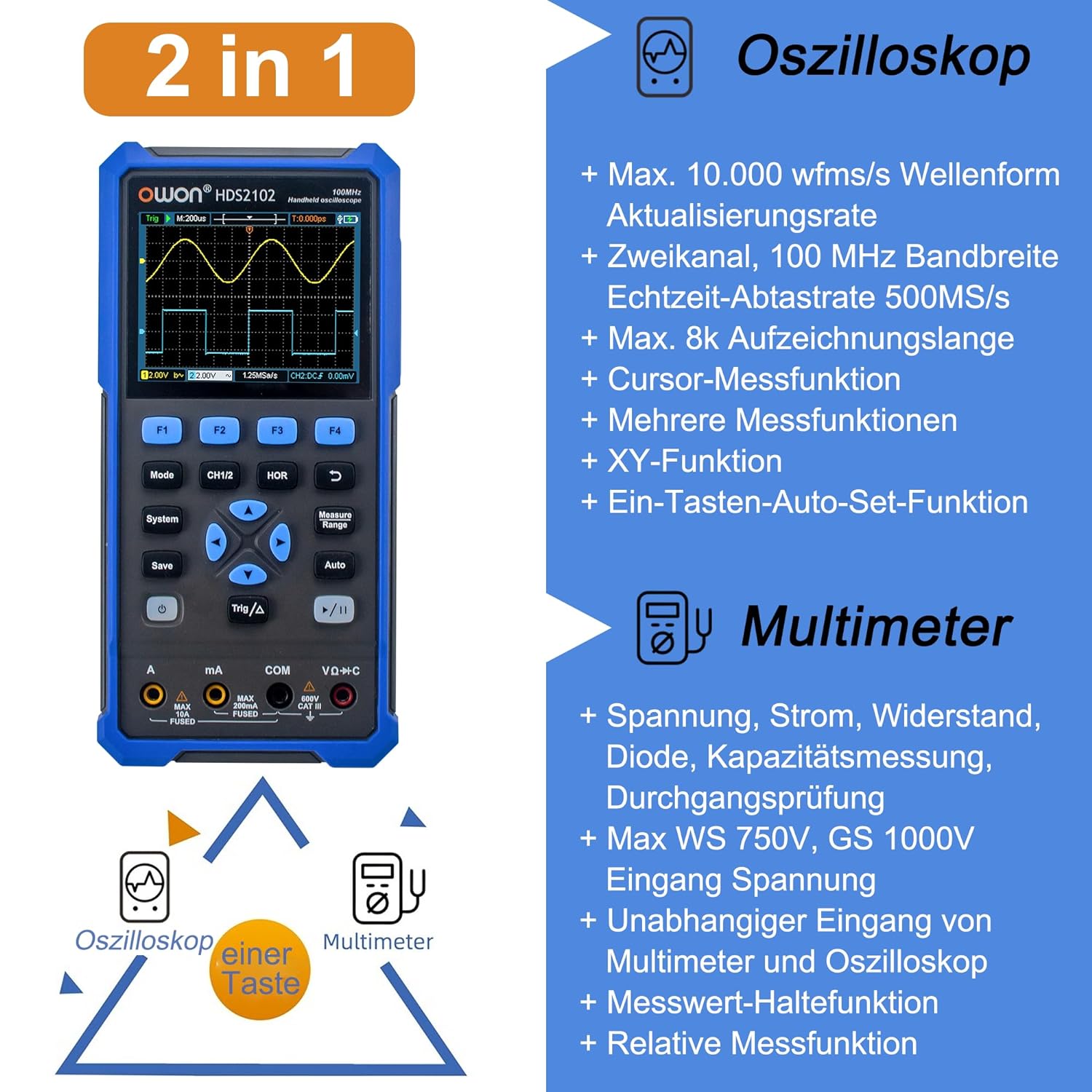 - Parameter---OWON HDS2102 3.5 inch LCD portable oscilloscope with 2 channel (oscilloscope+multimeter), 100MHz bandwidth, 500MS/s sample rate, 8K record length; 10,000 wfrms/s waveform refresh rate; 8 bits vertical resolution; 10mV/div - 10V/div vertical