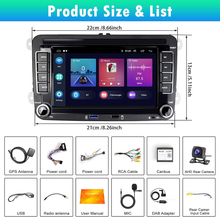 - 【Autoradio mit DAB+ für VW】: Dieses DAB Autoradio Doppel din mit Navi passend für viele VW Modellen . Die Produktabmessungen von Android Car Audio sind:obere Seitenlänge 220 mm * untere Seitenlänge 210 mm * Höhe 130 mm. Ausgestattet mit Android 11-System, 7-Zoll-High-Definition-Touchscreen, RAM 2G ROM 32G. mit DAB/DAB+,Unterstützt USB-OBD-DVR Mikrofon AHD-Rückfahrkamera.