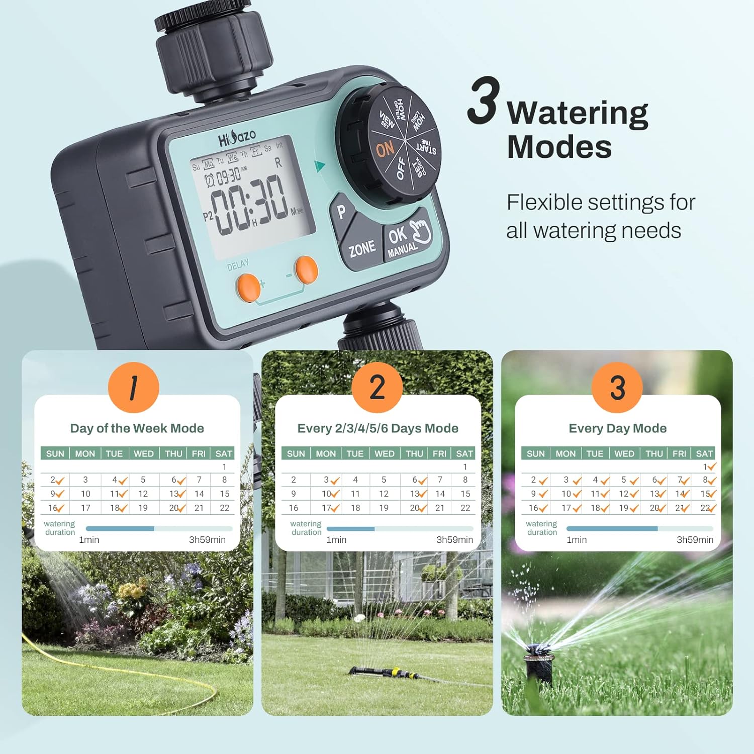 - 3 Bewässerungsmodi: Täglicher Modus, Modus alle 2/3/4/5/6 Tage und Wochentagmodus, 3 Bewässerungsmodi zur Auswahl, um festzulegen, wie oft die Pflanzen bewässert werden sollen. Flexible Einstellungen erfüllen alle Bewässerungsanforderungen. Es