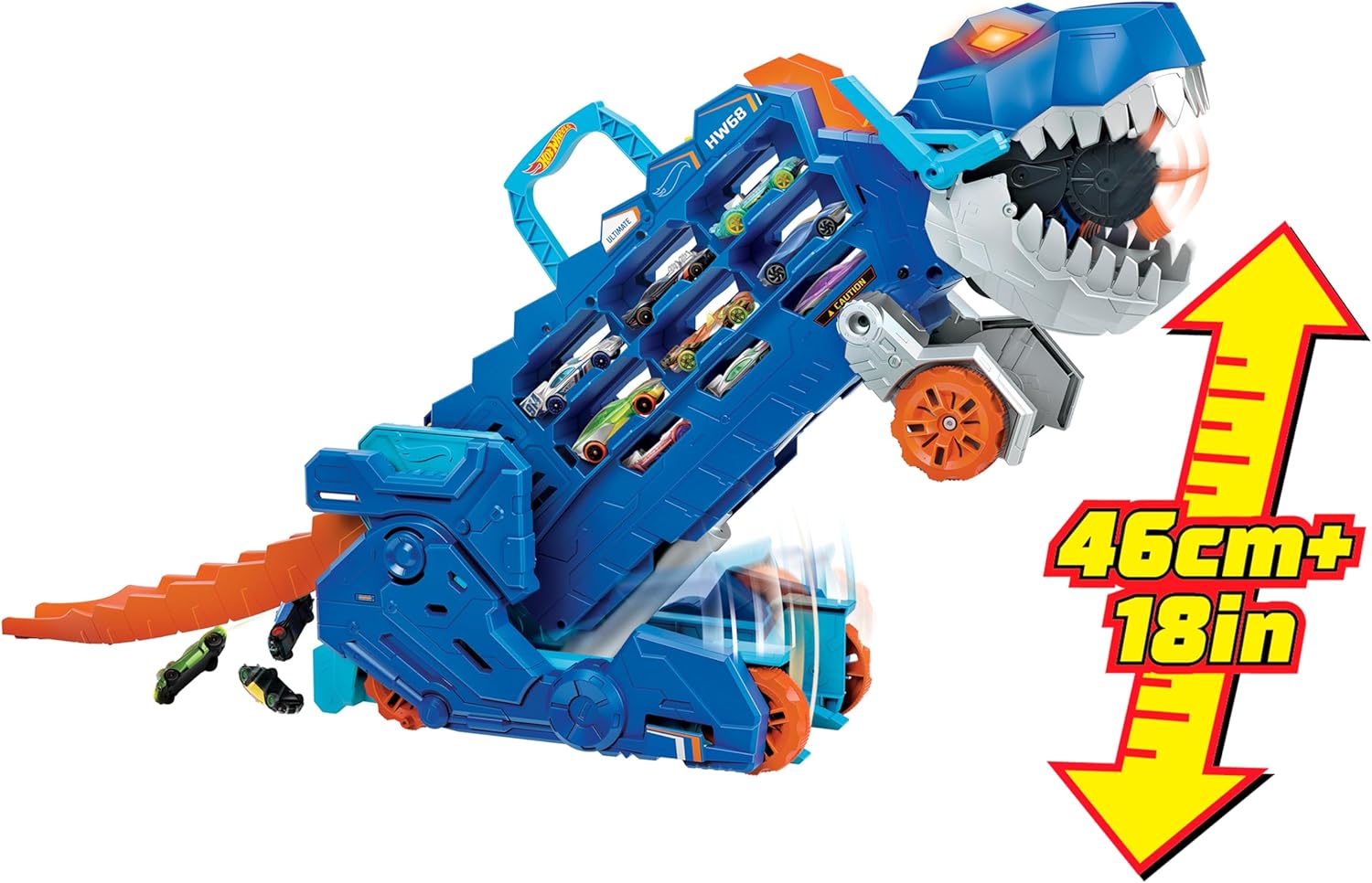 - Der Hot Wheels City Ultimative Transporter mit Platz für mehr als 20 Spielzeugautos lässt sich in einen tobenden, stampfenden T-Rex verwandeln