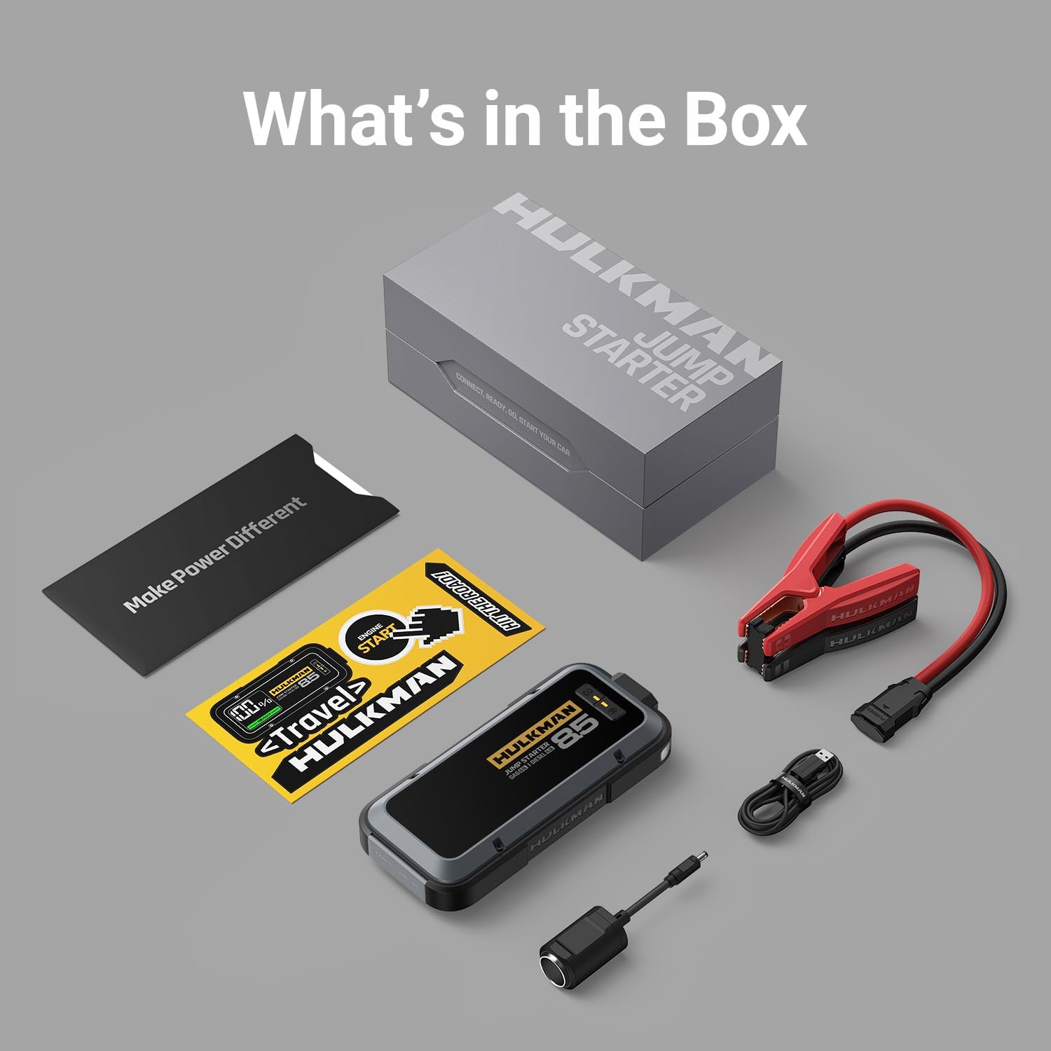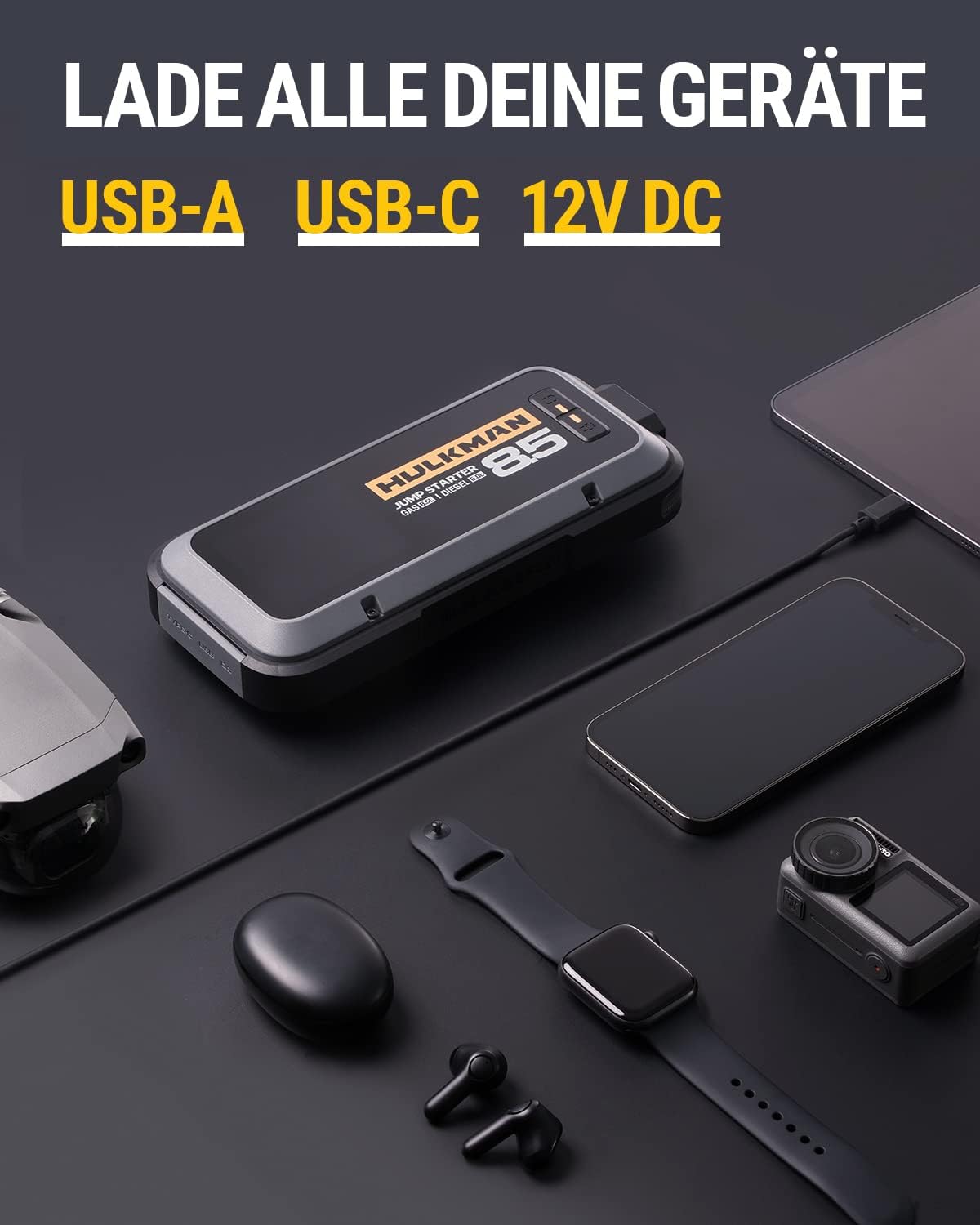 - đăIN DER BOXă: In der Box finden Sie das Alpha 85 Starthilfe Autobatterie, ein SC 65W LadegerĂ€t, mit Gummi umwickelte Starthilfeklemmen, ein Typ-C USB-Kabel (Ausgang) und einen DC 12V ZigarettenanzĂŒnder-Steckdosen-Adapter. Unsere