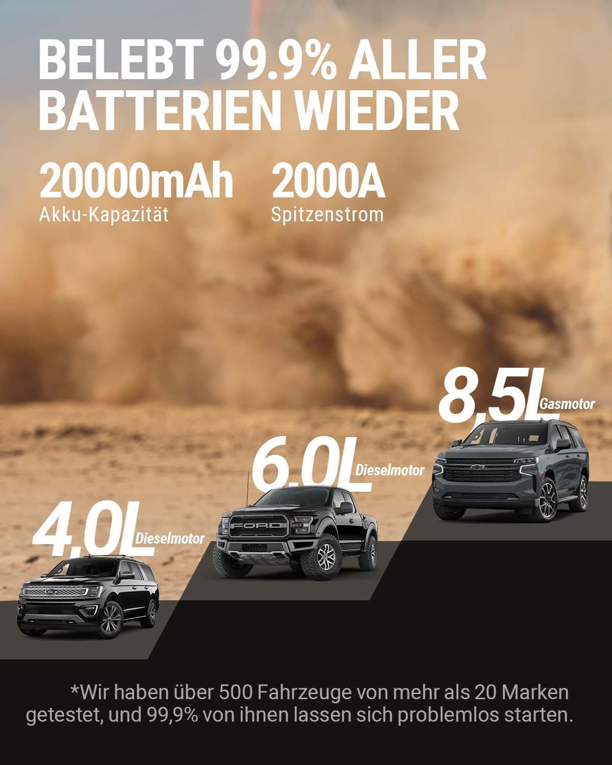 - đȘăSTART VOLLSTĂNDIG LEERER BATTERIENă: Leistungsstark und sicher, um Ihre vollstĂ€ndig leere Autobatterie zu starten. 2000 Ampere Spitzenstartstrom, speziell fĂŒr Fahrzeuge bis zu 8,5L Gas/6,0L Dieselmotoren. Bis zu 60 Starts mit einer einzigen