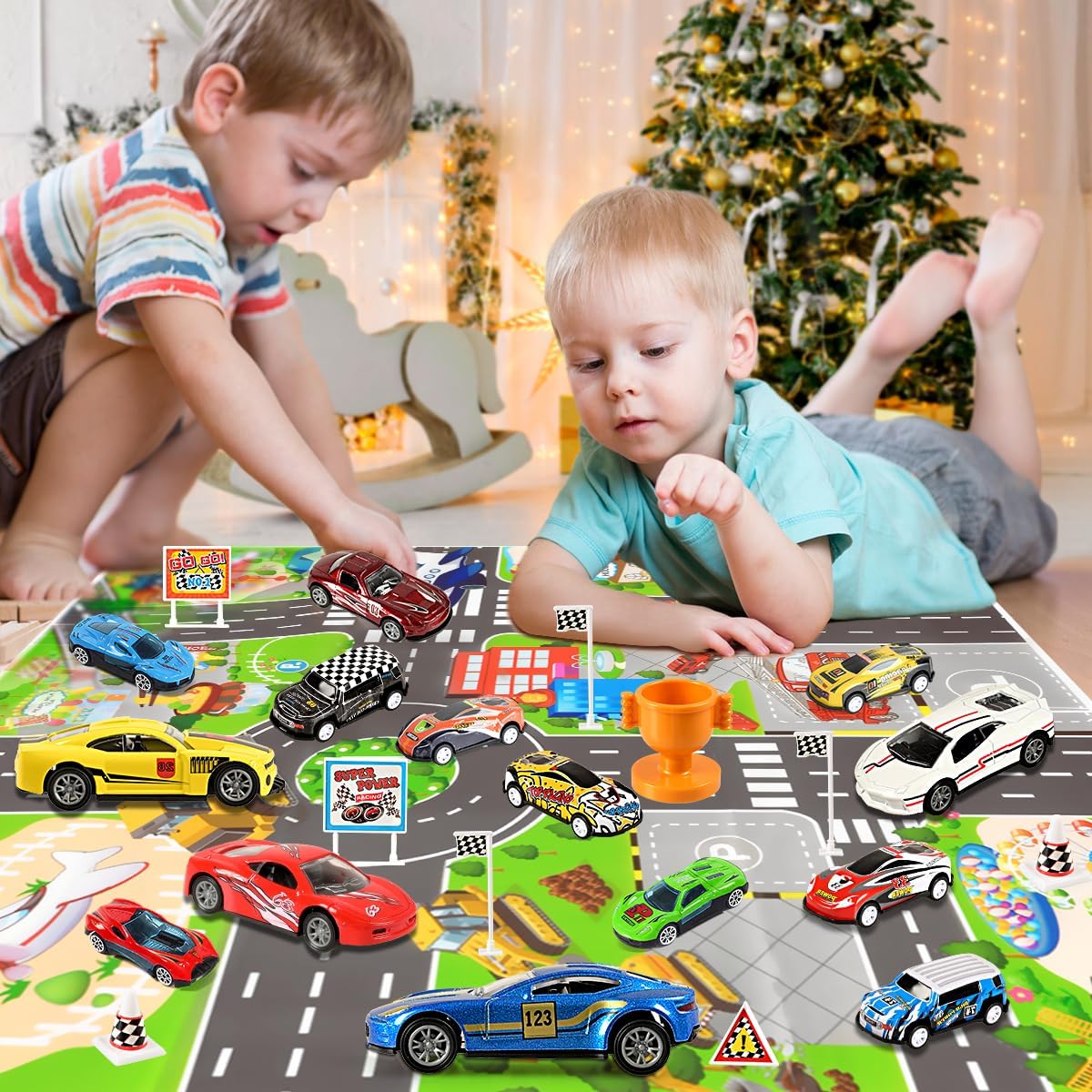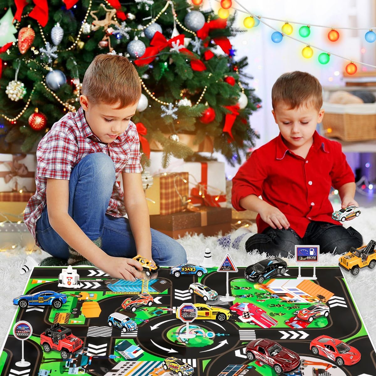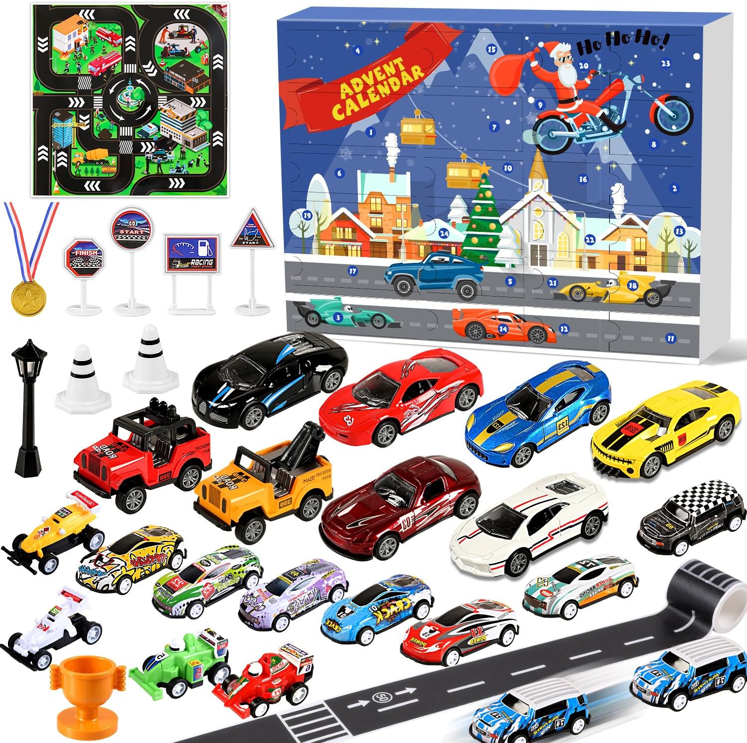 - Adventskalender Fahrzeuge enthältet 15 Rennenwagen +2 Jeep Auto+ 4 Sportwagen + 13 Strasse Zeichen + Medaillen + Trophäen + 1 Spielmatte. Langanhaltender Rennspass durch unzählige Kombination möglichkeiten der Fahrzeugen und Mitgebsel. Geniessen Sie