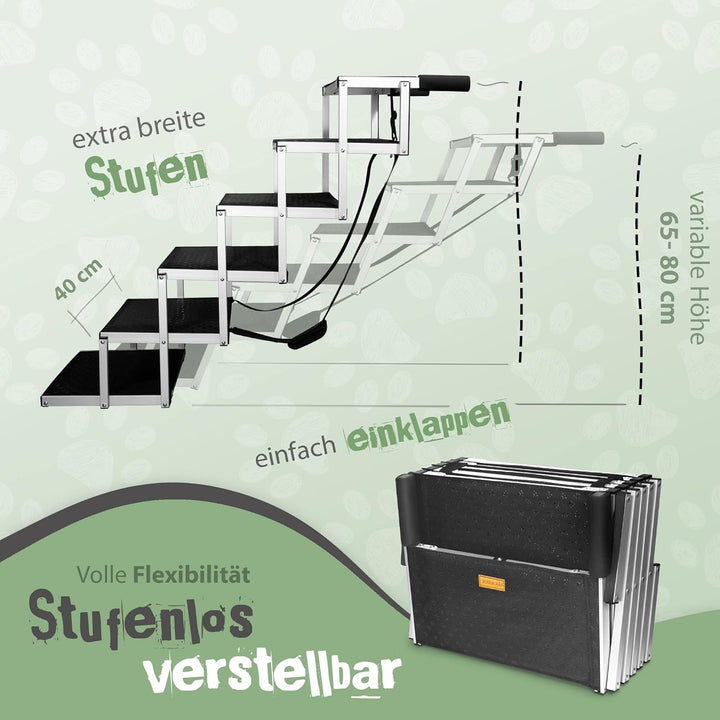 - PASST FÜR DEIN AUTO - Diese Tiertreppe ist stufenlos einstellbar. Mit bis zu 80cm Höhe perfekt für SUVs, Kombis und Vans. Anders als Rampen ist sie leicht zu verstauen u. transportieren