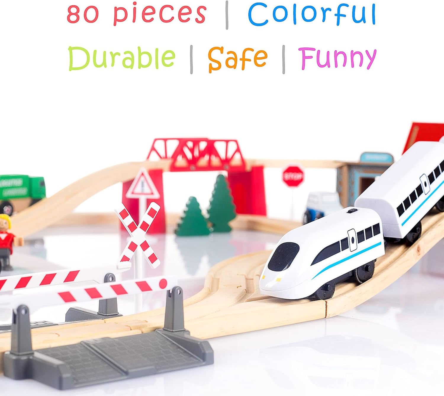 - ✨【Grosses Eisenbahn Elektrisch für Kinder set mit 80 Elementen!】- Das Ganze besteht aus vielen interessanten Elementen, darunter beispielsweise Fahrzeuge, Verkehrszeichen, Bäume, Barriere und Brücke. Eine grosse Anzahl an Zubehör macht den